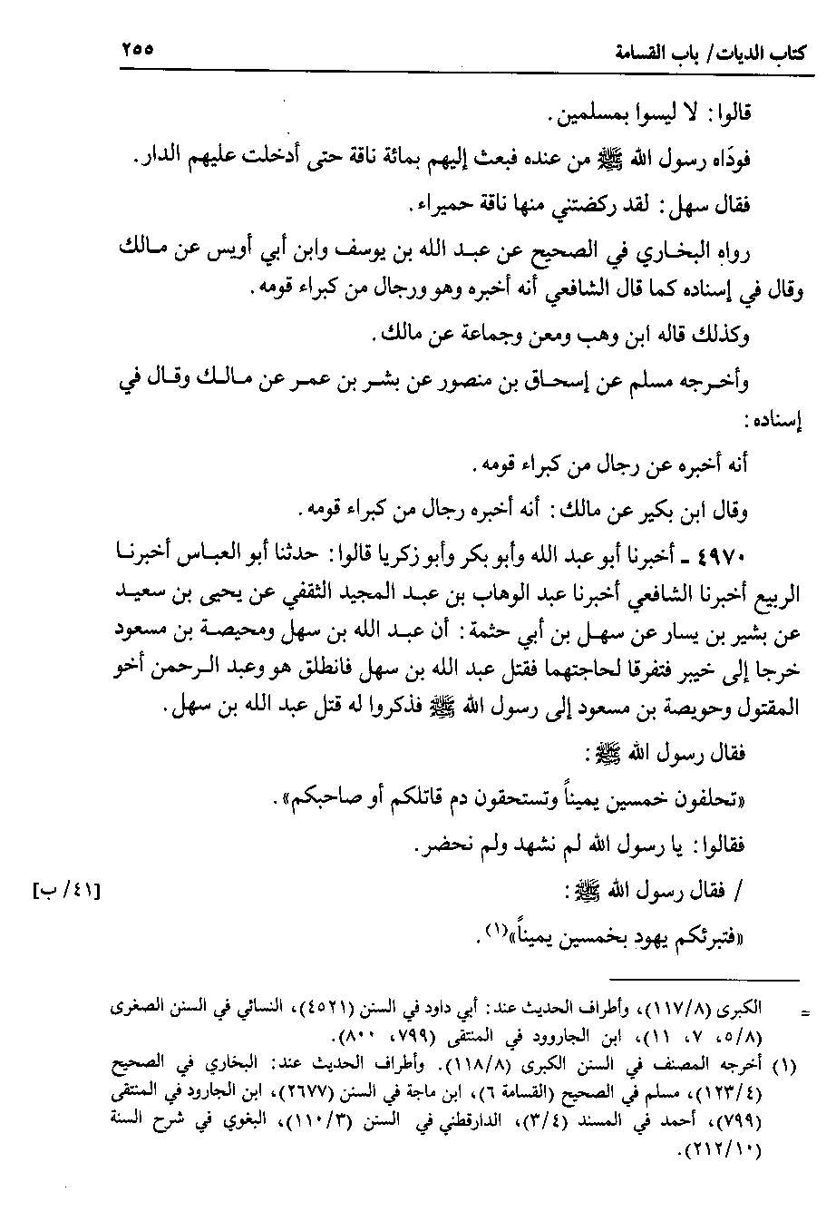 4970 - أخبرنا أبو عبد الله وأبو بكر وأبو زكريا قالوا : حدثنا أبو العباس أخبرنا الربيع أخبرنا الشافعي أخبرنا عبد الوهاب بن عبد المجيد الثقفي عن يحيى بن سعيد عن بشير بن يسار عن سهل بن أبي حثمة : أن عبد الله بن سهل ومحيصة بن مسعود خرجا إلى خيبر فتفرقا لحاجتهما فقتل عبد الله بن سهل فانطلق هو وعبد الرحمن أخو المقتول وحويصة بن مسعود إلى رسول الله صلى الله عليه وسلم فذكروا له قتل عبد الله بن سهل.