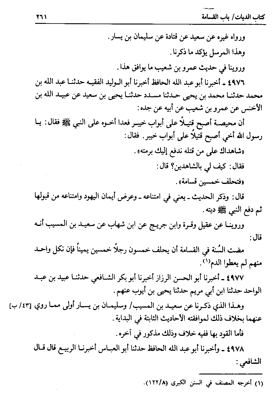4976 - أخبرنا أبو عبد الله الحافظ أخبرنا أبو الوليد الفقيه حدثنا عبد الله بن محمد حدثنا محمد بن يحيى حدثنا مسدد حدثنا يحيى بن سعيد عن عبيد الله بن الأخنس عن عمرو بن شعيب عن أبيه عن جده : أن محيصة أصبح قتيلاً على أيواب خيبر فعدا أخوه على النبي صلى الله عليه وسلم فقال : يا رسول الله أخي أصبح قتيلاً على أبواب خيبر . فقال : شاهداك على من قتله ندفع إليك برمته.