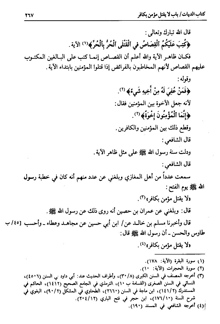 قال الشافعي : سمعت عدداً من أهل المغازي وبلغني عن عدد منهم أنه كان في خطبة رسول الله صلى الله عليه وسلم يوم الفتح : لا يقتل مؤمن بكافر.