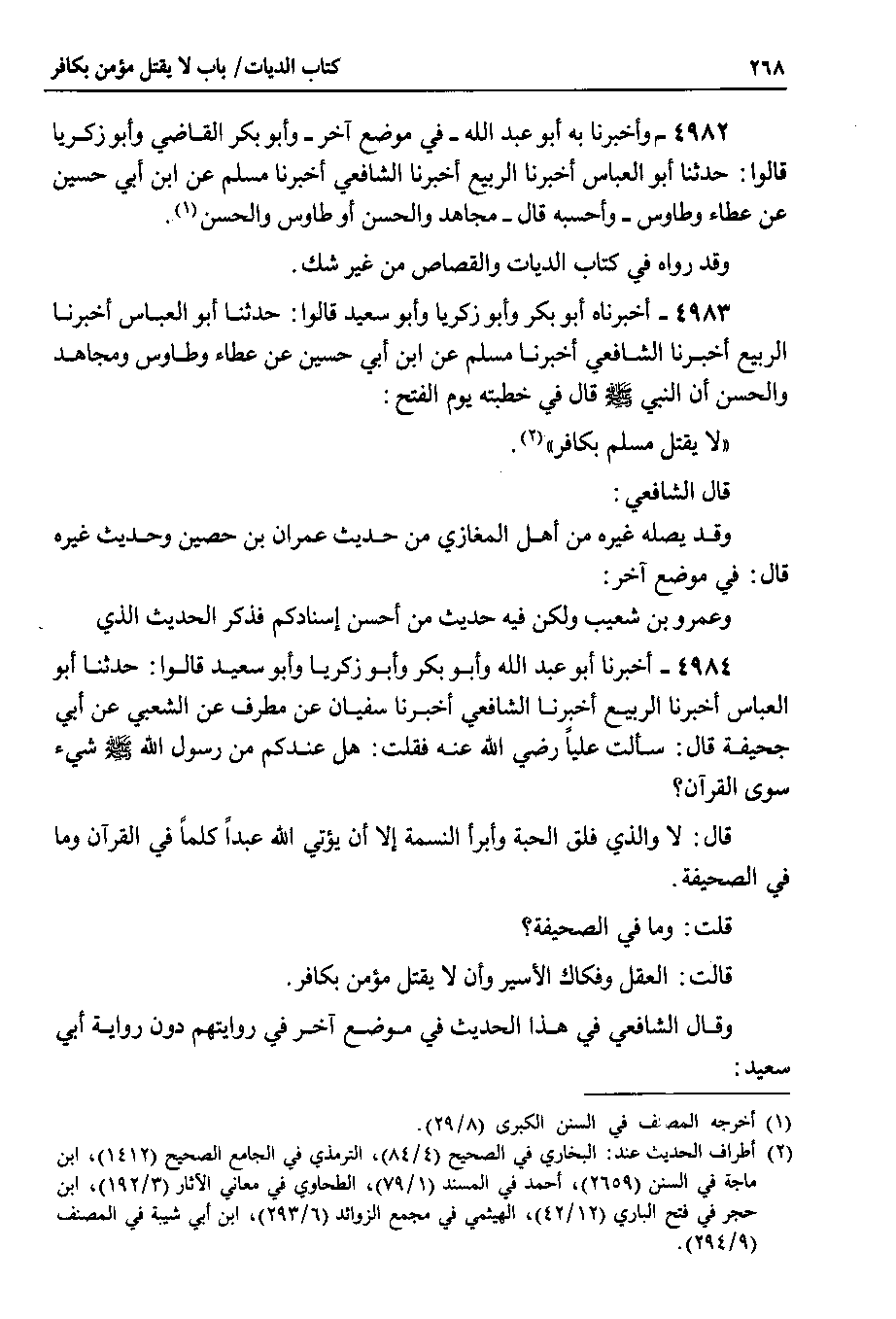 4983 - أخبرناه أبو بكر وأبو زكريا وأبو سعيد قالوا : حدثنا أبو العباس أخبرنا الربيع أخبرنا الشافعي أخبرنا مسلم عن ابن أبي حسين عن عطاء وطاوس ومجاهد والحسن أن النبي صلى الله عليه وسلم قال في خطبته يوم الفتح : لا يقتل مسلم بكافر.