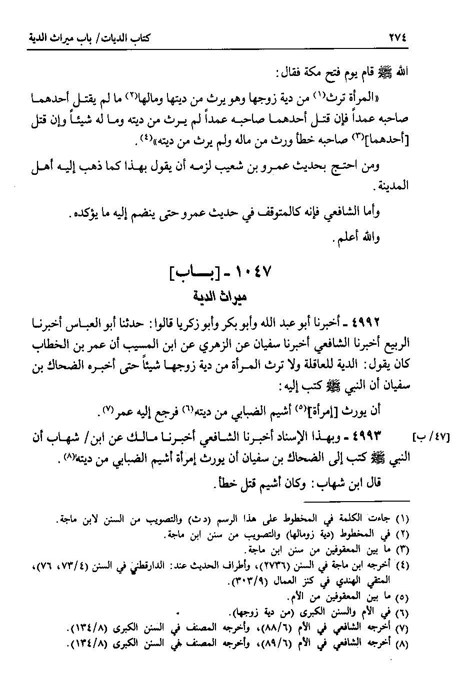4992 - أخبرنا أبو عبد الله وأبو بكر وأبو زكريا قالوا : حدثنا أبو العباس أخبرنا الربيع أخبرنا الشافعي أخبرنا سفيان عن الزهري عن ابن المسيب أن عمر بن الخطاب كان يقول : الدية للعاقلة ولا ترث المرأة من دية زوجها شيئاً حتى أخبره الضحاك بن سفيان أن النبي صلى الله عليه وسلم كتب إليه : أن يورث إمرأة أشيم الضباني من ديته فرجع إليه عمر.