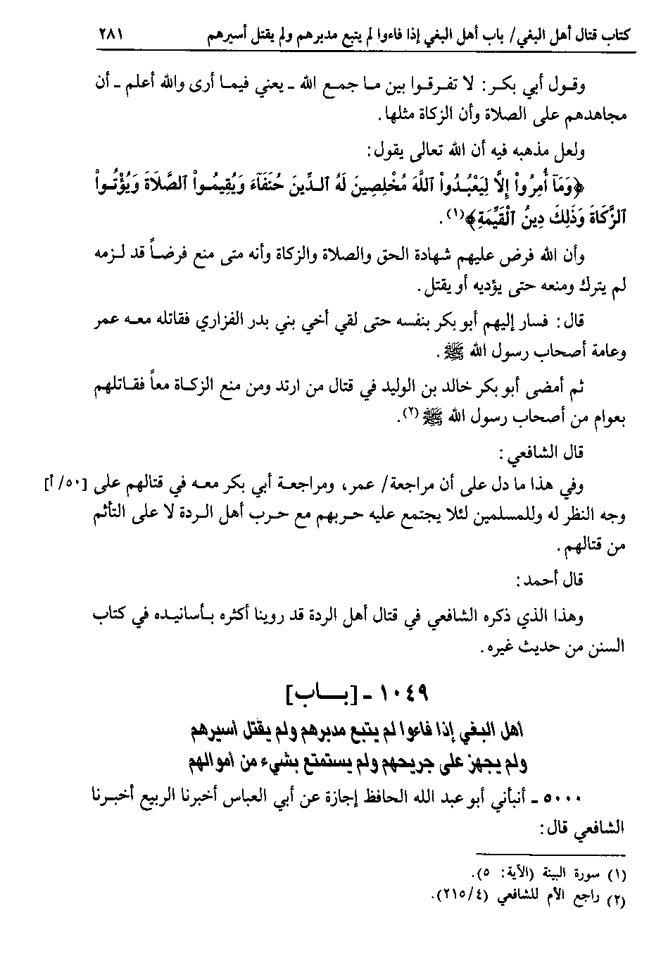 1049 - باب أهل البغي إذا فاءوا لم يتبع مدبرهم ولم يقتل أسيرهم ولم يجهز على جريحهم ولم يستمتع بشيء من أموالهم