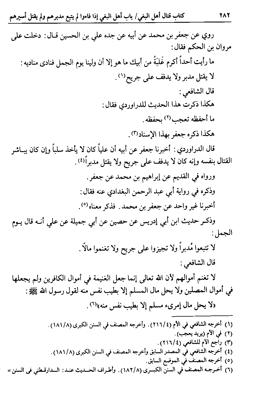 قال الدراوردي : أخبرنا جعفر عن أبيه أن علياً كان لا يأخذ سلباً وإن كان يباشر القتال بنفسه وإنه كان لا يدفف على جريح ولا يقتل مدبراً.