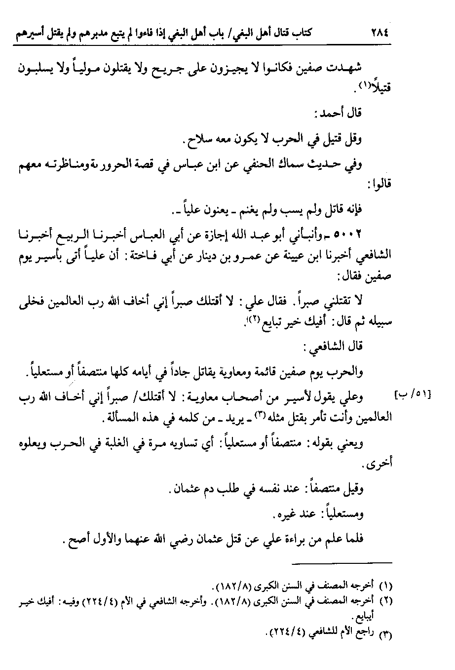 5002 - وأنبأني أبو عبد الله إجازة عن أبي العباس أخبرنا الربيع أخبرنا الشافعي أخبرنا ابن عيينة عن عمرو بن دينار عن أبي فاختة : أن علياً أتى بأسير يوم صفين فقال : لا تقتلني صبراً . فقال علي : لا أقتلك صبراً إني أخاف الله رب العالمين فخلى سبيله ثم قال : أفيك خير تبايع.