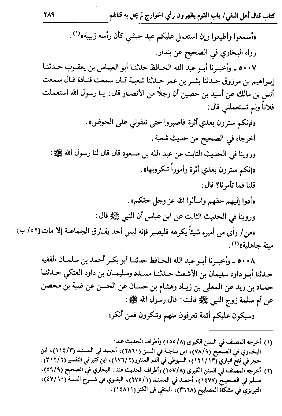 وروينا في الحديث الثابت عن ابن عباس أن النبي صلى الله عليه وسلم قال : من رأى من أميره شيئاً يكرهه فليصبر فإنه ليس أحد يفارق الجماعة إلا مات ميتة جاهلية.