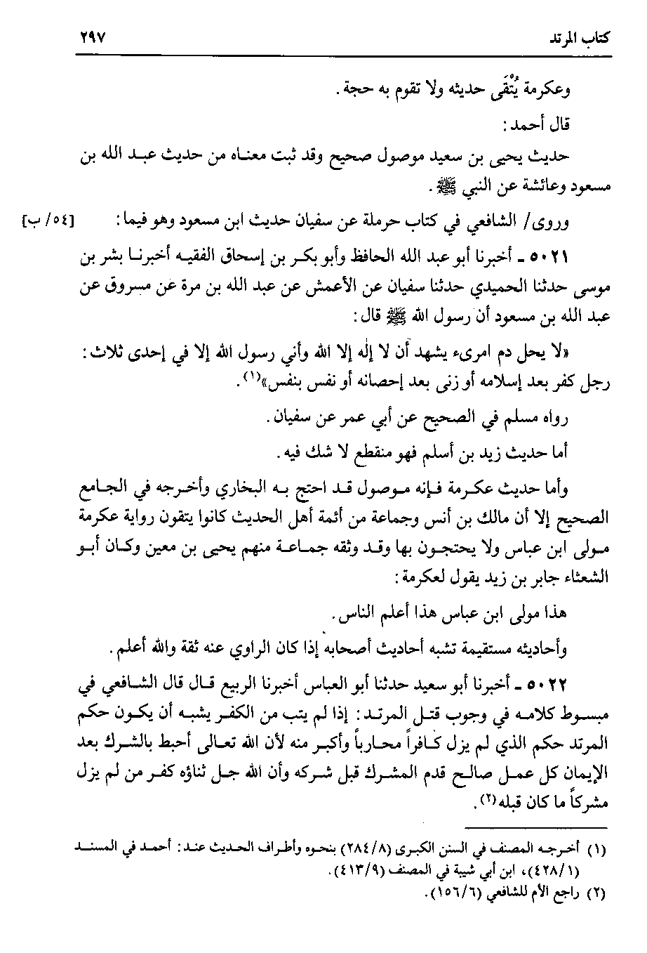 وروى الشافعي في كتاب حرملة عن سفيان حديث ابن مسعود وهو فيما 5021 - أخبرنا أبو عبد الله الحافظ وأبو بكر بن إسحاق الفقيه أخبرنا بشر بن موسى حدثنا الحميدي حدثنا سفيان عن الأعمش عن عبد الله بن مرة عن مسروق عن عبد الله بن مسعود أن رسول الله صلى الله عليه وسلم قال : لا يحل دم امرىء يشهد أن لا إله إلا الله وإني رسول الله إلا في إحدى ثلاث : رجل كفر بعد إسلامه أو زنى بعد إحصانة أو نفس بنفس.