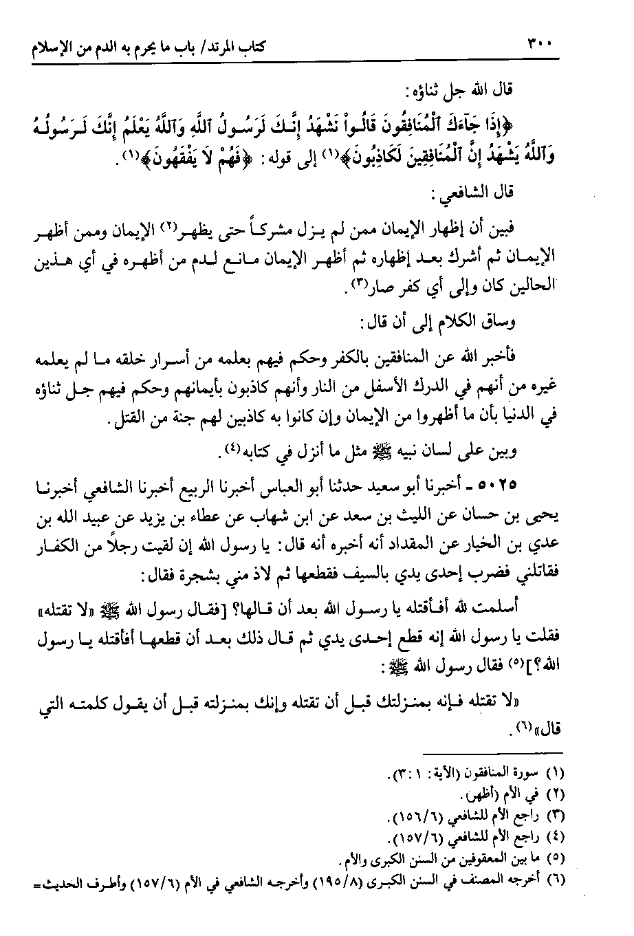 قال الشافعي : فببن أن إظهار الإيمان ممن لم يزل مشركاً حتى يظهر الإيمان وممن أظهر الإيمان ثم أشرك بعد إظهاره ثم أظهر الإيمان مانع لدم من أظهره في أي هذين الحالين كان وإلى أي كفر صار.