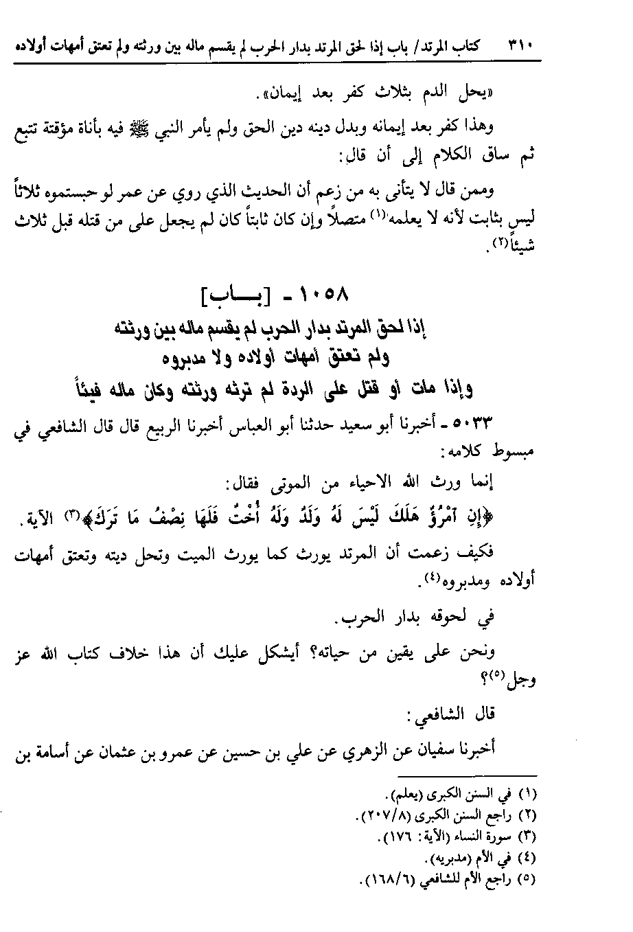 1058 - باب إذا لحق المرتد بدار الحرب لم يقسم ماله بين ورثته ولم تعتق أمهات أولاده ولا مدبروه وإذا مات أو قتل على الردة لم ترثه ورثته وكان ماله فيئاً