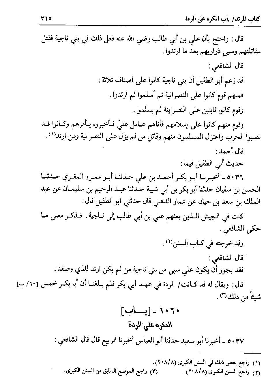 قال أحمد : حديث أبي الطفيل فيما 5036 - أخبرنا أبو بكر أحمد بن علي حدثنا أبو عمرو المقري حدثنا الحسن بن سفيان حدثنا أبو بكر بن أبي شيبة حدثنا عبد الرحيم بن سليمان عن عبد الملك بن سعد بن حيان عن عمار الدهني قال حدثني أبو الطفيل قال : كنت في الجيش الذين بعثهم علي بن أبي طالب إلى ناجية . فذكر معنى ما حكى الشافعي.