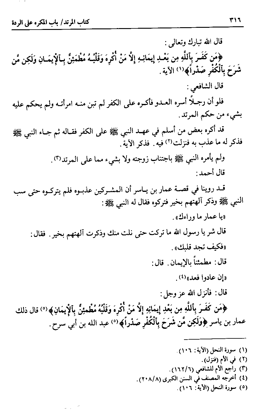 6 @قال الله تبارك وتعالى {من كفر بالله من بعد إيمانه إلا من أكره وقلبه مطمئن بالإيمان ولكن من شرح بالكفر صدرا} الآية.