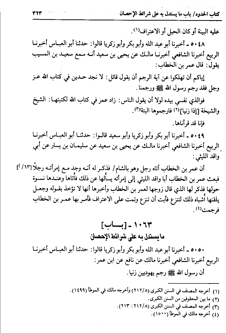 5048 - أخبرنا أبو عبد الله وأبو بكر وأبو زكريا قالوا : حدثنا أبو العباس أخبرنا الربيع أخبرنا الشافعي أخبرنا مالك عن يحيى بن سعيد أنه سمع سعيد بن المسيب يقول : قال عمر بن الخطاب : إياكم أن تهلكوا عن آية الرجم أن يقول قائل : لا نجد حدين في كتاب الله عز وجل فقد رجم رسول الله صلى الله عليه وسلم ورجمنا.
