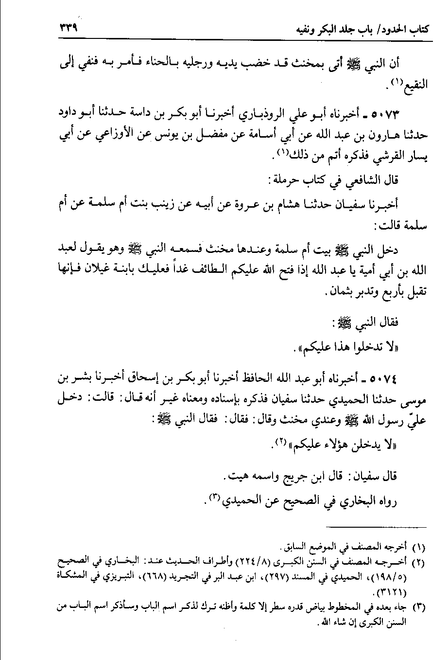 5074 - أخبرناه أبو عبد الله الحافظ أخبرنا أبو بكر بن إسحاق أخبرنا بشر بن موسى حدثنا الحميدي حدثنا سفيان فذكره بإسناده ومعناه غير أنه قال : قالت : دخل عليّ رسول الله صلى الله عليه وسلم وعندي مخنث وقال : فقال النبي صلى الله عليه وسلم : لا يدخلن هؤلاء عليكم.