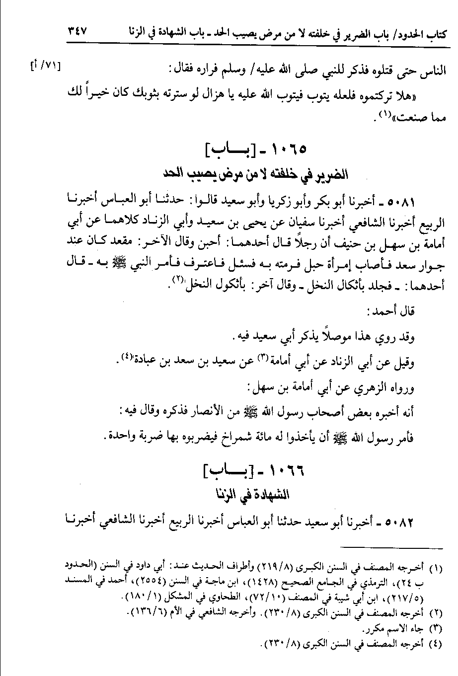 ورواه الزهري عن أبي أمامة بن سهل : أنه أخبره بعض أصحاب رسول الله صلى الله عليه وسلم من الأنصار فذكره وقال فيه : فأمر رسول الله صلى الله عليه وسلم أن يأخذوا له مِئَة شمراخ فيضربوه بها ضربة واحدة.