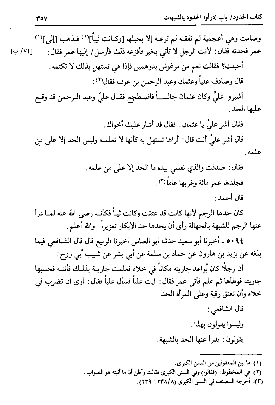 5094 - أخبرنا أبو سعيد حدثنا أبو العباس أخبرنا الربيع قال قال الشافعي فيما بلغه عن يزيد بن هارون عن حماد بن سلمة عن أبي بشر عن شبيب أبي روح : أن رجلاً كان يُواعد جاريته مكاناً في خلاء فعلمت جارية بذلك فأتته فحسبها جاريته فوطأها ثم علم فأتى عمر فقال : ايت علياً فسأل علياً فقال : أرى أن تضرب في خلاء وأن تعتق رقبة وعلى المرأة الحد.