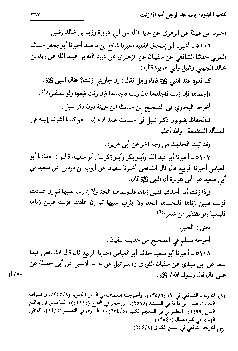 5106 - أخبرنا أبو إسحاق الفقيه أخبرنا شافع بن محمد أخبرنا أبو جعفر حدثنا المزني حدثنا الشافعي عن سفيان عن الزهري عن عبيد الله بن عبد الله عن زيد بن خالد الجهني وشبل وأبي هريرة قالوا : كنا قعود عند النبي صلى الله عليه وسلم فأتاه رجل فقال : إن جاريتي زنت ؟ فقال النبي صلى الله عليه وسلم : أجلدها فإن زنت فاجلدها فإن زنت فاجلدها فإن زنت فبعها ولو بضفير.