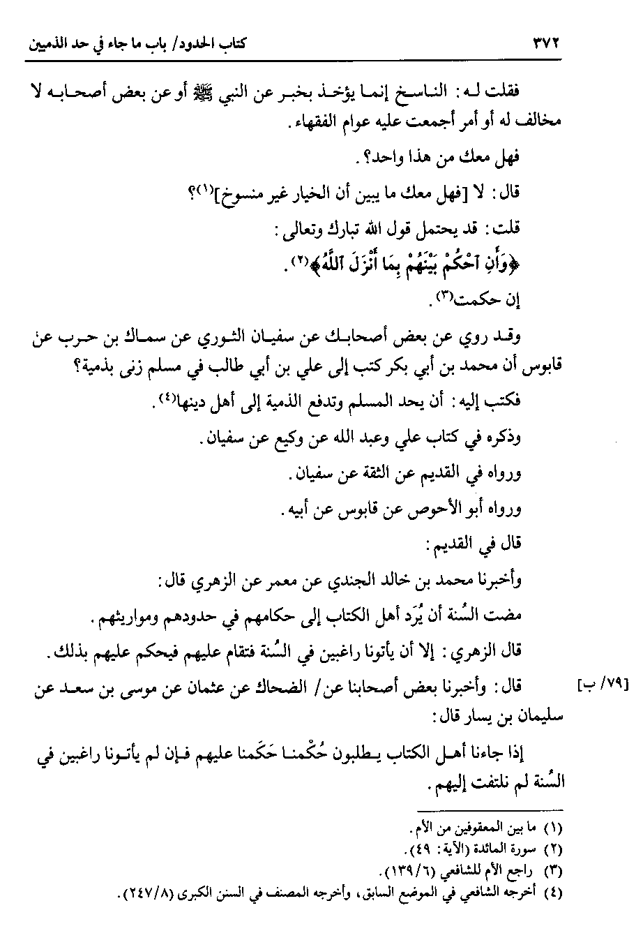 قال في القديم : وأخبرنا محمد بن خالد الجندي عن معمر عن الزهري قال : مضت السُنة أن يُرَد أهل الكتاب إلى حكامهم في حدودهم ومواريثهم.