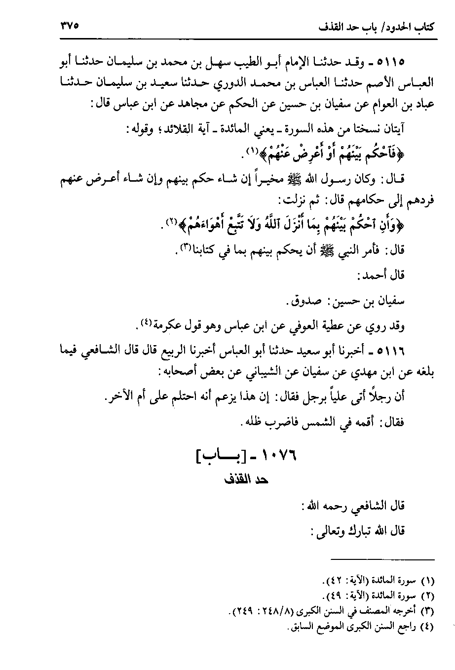 5115 - وقد حدثنا الإمام أبو الطيب سهل بن محمد بن سليمان حدثنا أبو العباس الأصم حدثنا العباس بن محمد الدوري حدثنا سعيد بن سليمان حدثنا عباد بن العوام عن سفيان بن حسين عن الحكم عن مجاهد عن ابن عباس قال : آيتان نسختا من هذه السورة - يعني المائدة - آية القلائد ؛ وقوله {فاحكم بينهم أو أعرض عنهم}.