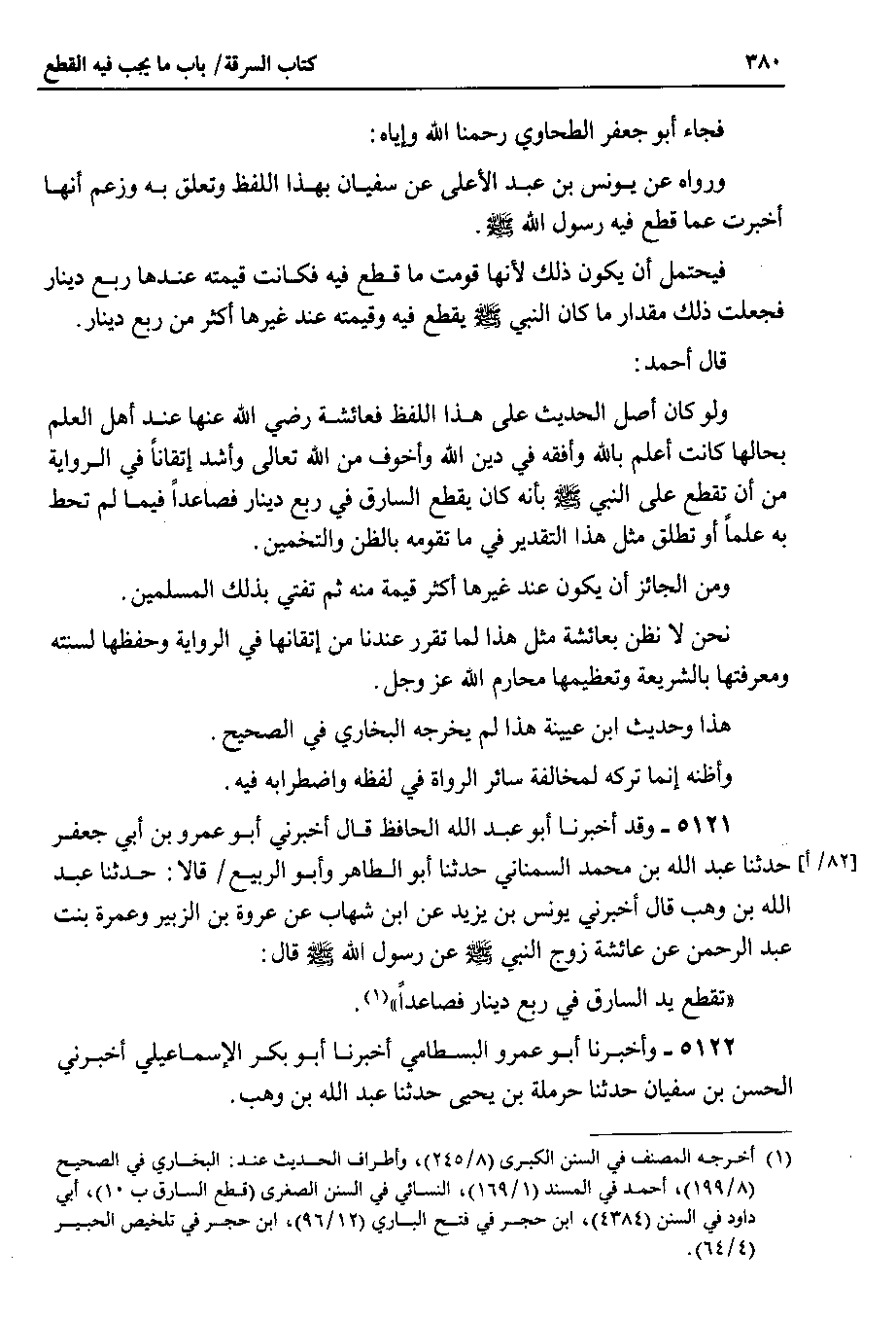 فجاء أبو جعفر الطحاوي رحمنا الله وإياه : ورواه عن يونس بن عبد الأعلى عن سفيان بهذا اللفظ وتعلق به وزعم أنها أخبرت عما قطع فيه رسول الله صلى الله عليه وسلم : فيحتمل أن يكون ذلك لأنها قومت ما قطع فيه فكانت قيمته عندها ربع دينار فجعلت ذلك مقدار ما كان النبي صلى الله عليه وسلم يقطع فيه وقيمته عند غيرها أكثر من ربع دينار.