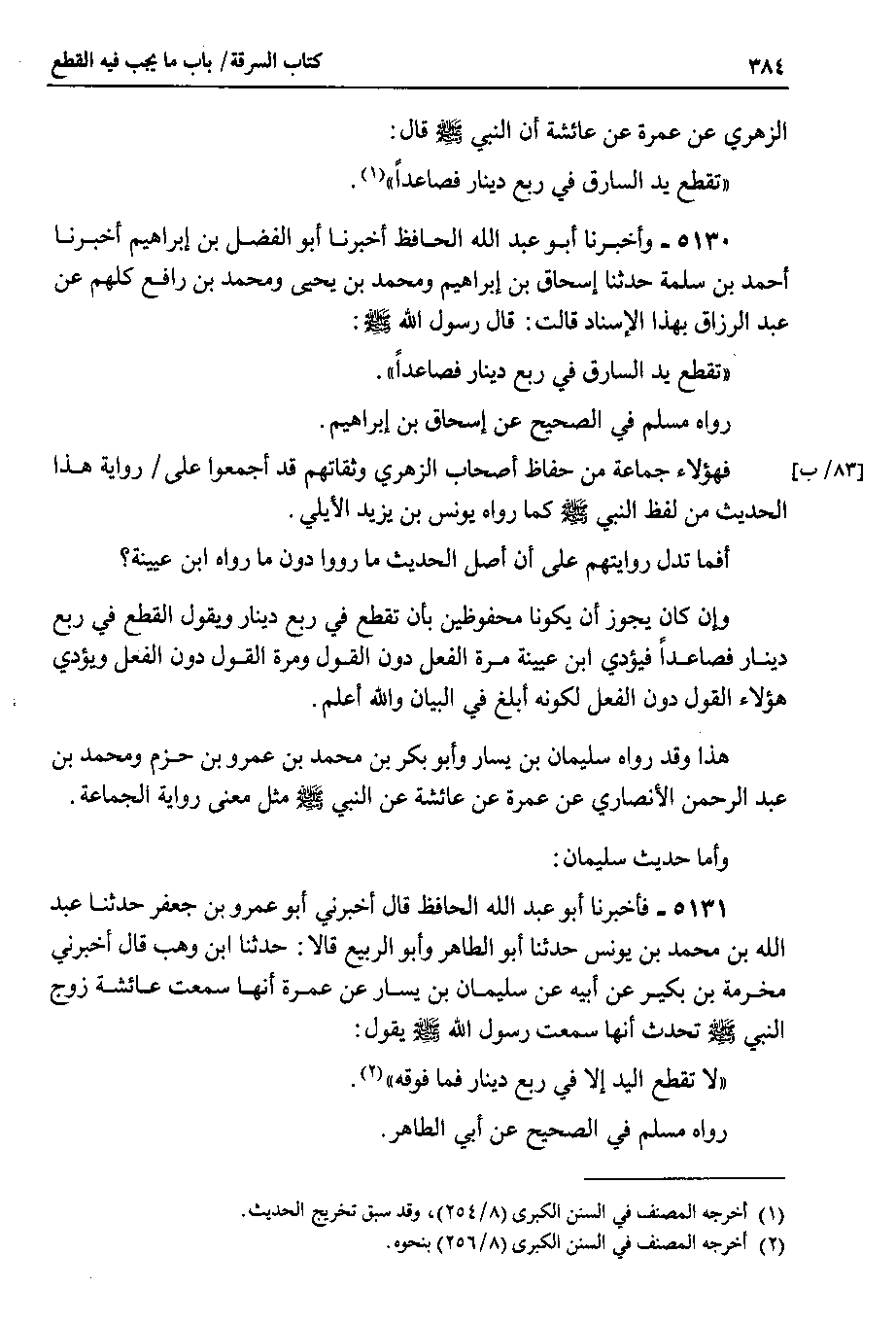أفما تدل روايتهم على أن أصل الحديث ما رووا دون ما رواه ابن عيينة ؟ وإن كان يجوز أن يكون محفوظين بأن تقطع في ربع دينار ويقول القطع في ربع دينار فصاعداً فيؤدي ابن عيينة مرة الفعل دون القول ومرة القول دون الفعل ويؤدي هؤلاء القول دون الفعل لكونه أبلغ في البيان والله أعلم.