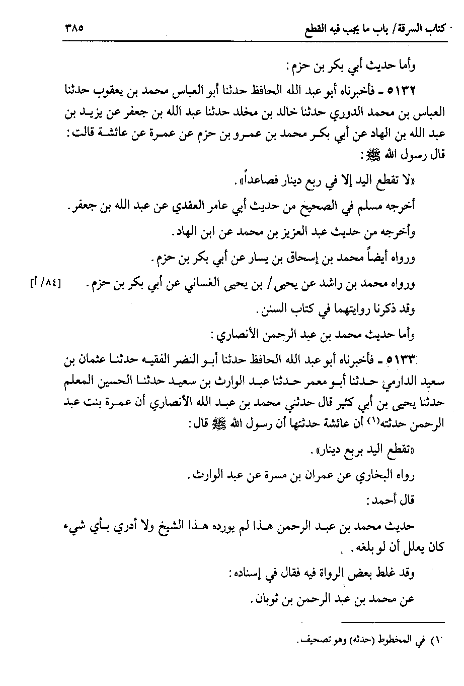 وأما حديث أبي بكر بن حزم 5132 - فأخبرناه أبو عبد الله الحافظ حدثنا أبو العباس محمد بن يعقوب حدثنا العباس بن محمد الدوري حدثنا خالد بن مخلد حدثنا عبد الله بن جعفر عن يزيد بن عبد الله بن الهاد عن أبي بكر محمد بن عمرو بن حزم عن عمرة عن عائشة قالت : قال رسول الله صلى الله عليه وسلم : لا تقطع اليد إلا في ربع دينار فصاعدًا.