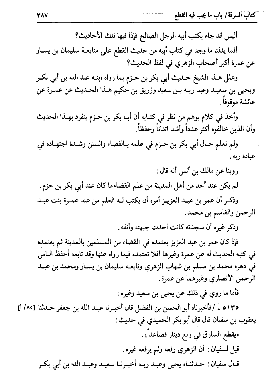 أليس قد جاء بكتب أبيه الرجل الصالح فإذا فيها تلك الأحاديث ؟ أفما يدلنا ما وجد في كتاب أبيه من حديث القطع على متابعة سليمان بن يسار عن عمرة أكبر أصحاب الزهري في لفظ الحديث ؟ وعلل هذا الشيخ حديث أبي بكر بن حزم بما رواه ابنه عبد الله بن أبي بكر ويحيى بن سعيد وعبد ربه بن سعيد وزريق بن حكيم هذا الحديث عن عمرة عن عائشة موقوفاً.
