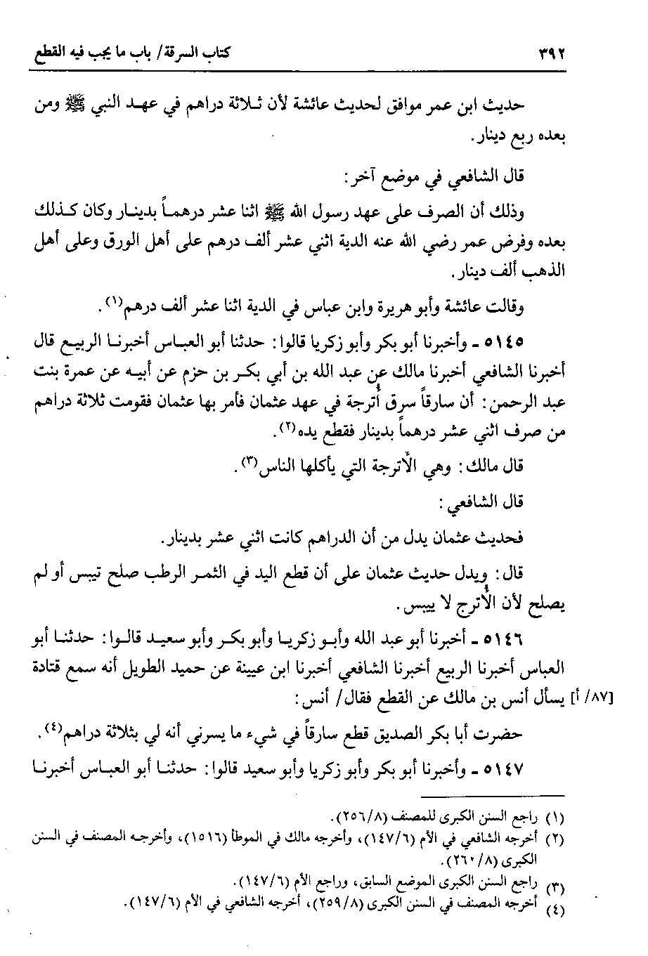 5146 - أخبرنا أبو عبد الله وأبو زكريا وأبو بكر وأبو سعيد قالوا : حدينا أبو العباس أخبرنا الربيع أخبرنا الشافعي أخبرنا ابن عيينة عن حميد الطويل أنه سمع قتادة يسأل أنس بن مالك عن القطع فقال أنس : حضرت أبا بكر الصديق قطع سارقاً في شيء ما يسرني أنه لي بثلاثة دراهم.