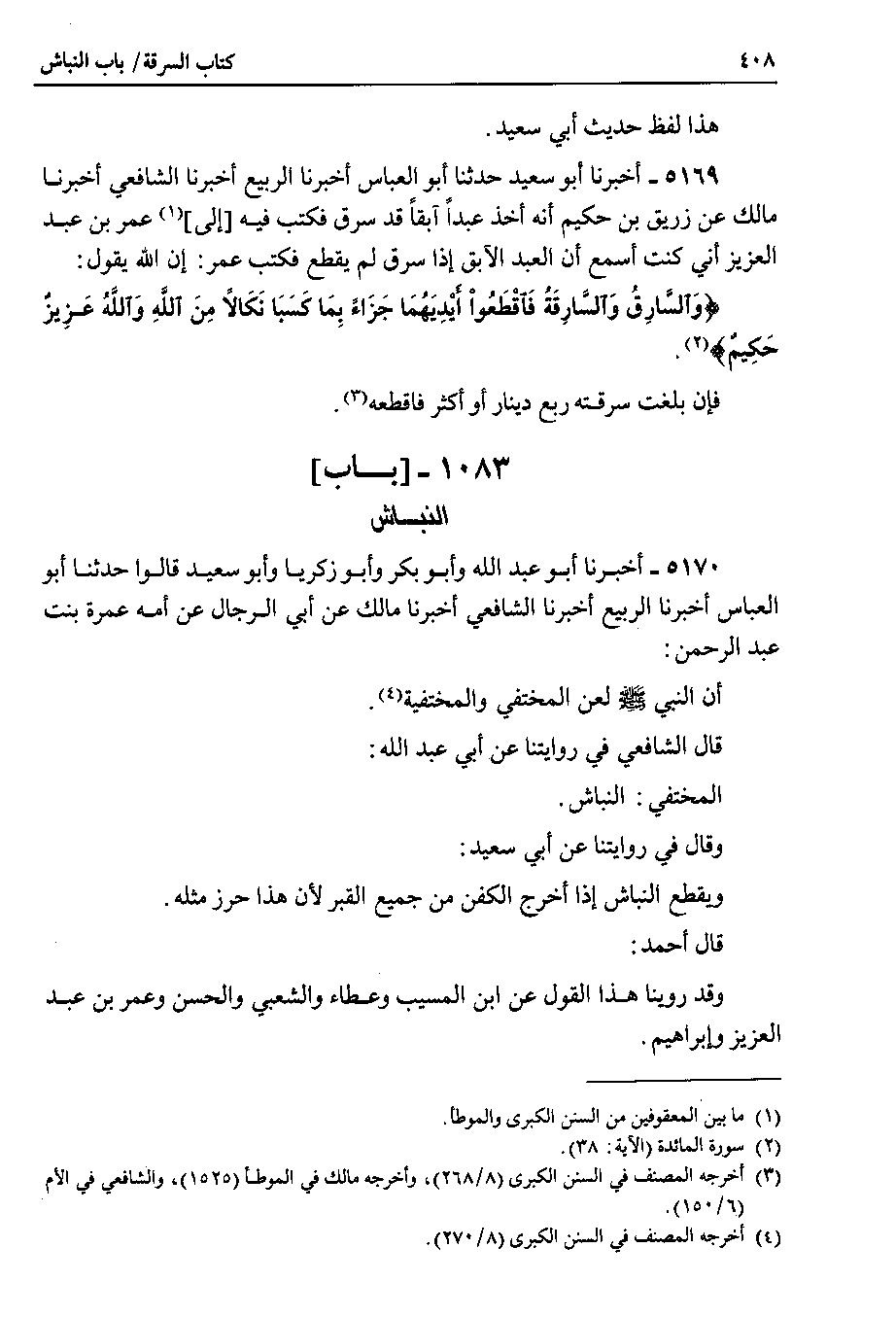 5169 - أخبرنا أبو سعيد حدثنا أبو العباس أخبرنا الربيع أخبرنا الشافعي أخبرنا مالك عن زريق بن حكيم أنه أخذ عبداً آبقاً قد سرق فكتب فيه إلى عمر بن عبد العزيز أني كنت أسمع أن العبد الآبق إذا سرق لم يقطع فكتب عمر : إن الله يقول {وَالسَّارِقُ وَالسَّارِقَهُ فَاقْطَعُواْ أَيْدِيَهُمَا جَزَاءً بِمَا كَسَبَا نَكَالاً مَنِ اللَّهِ وَاللَّهُ عَزِيزُ حَكِيمٌ ).
