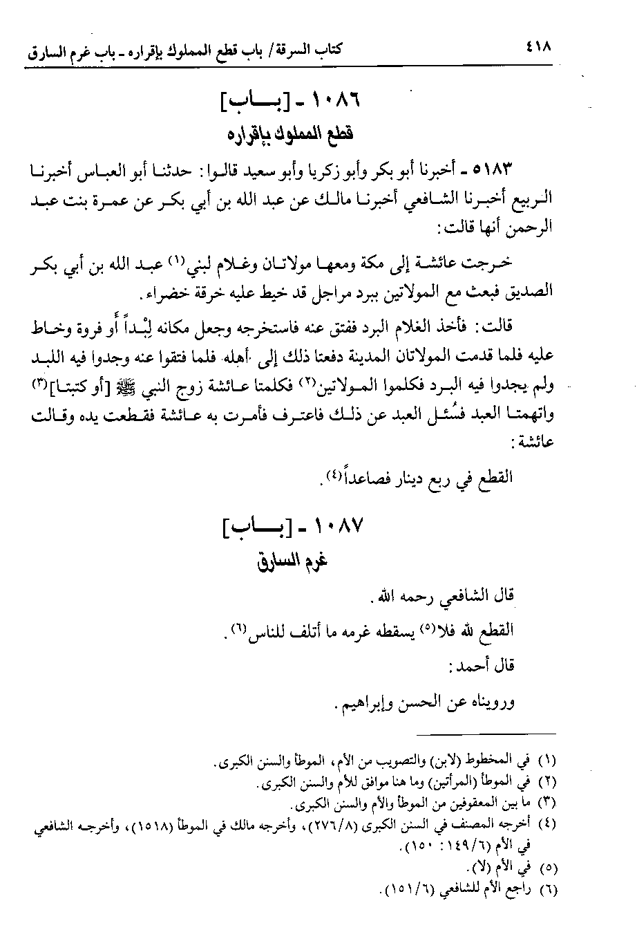 قالت : فأخذ الغلام البرد ففتق عنه فاستخرجه وجعل مكانه لِبْداً أَو فروة وخاط عليه فلما قدمت المولاتان المدينة دفعتا ذلك إلى أهله فلما فتقوا عنه وجدوا فيه اللبد ولم يجدوا فيه البرد فكلموا المولاتين فكلمتا عائشة زوج النبي صلى الله عليه وسلم أو كتبتا واتهمتا العبد فسئل العبد عن ذلك فاعترف فأمرت به عائشة فقطعت يده وقالت عائشة : القطع في ربع دينار فصاعدًا.