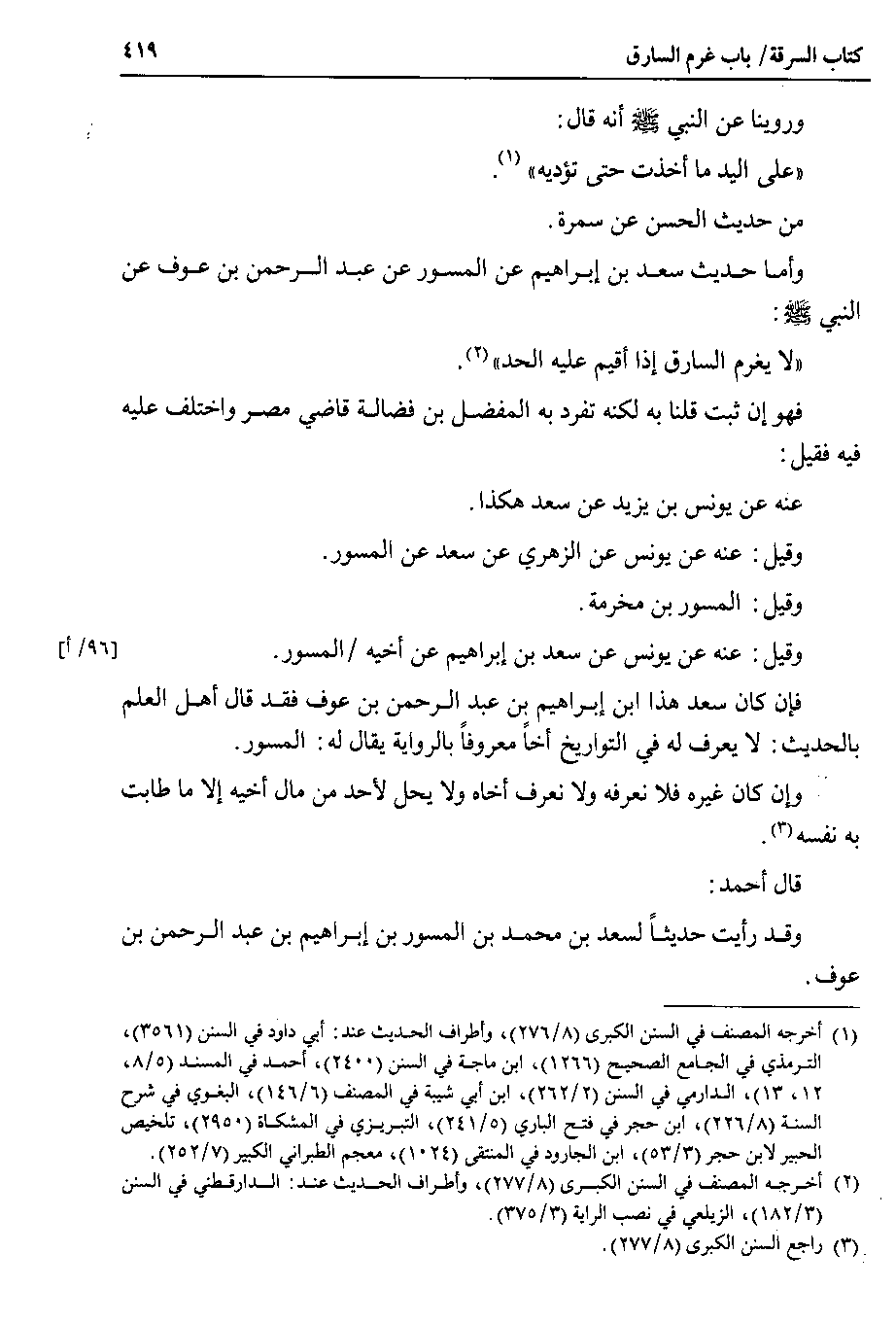 وأما حديث سعد بن إبراهيم عن المسور عن عبد الرحمن بن عوف عن النبي صلى الله عليه وسلم : لا يغرم السارق إذا أقيم عليه الحد.