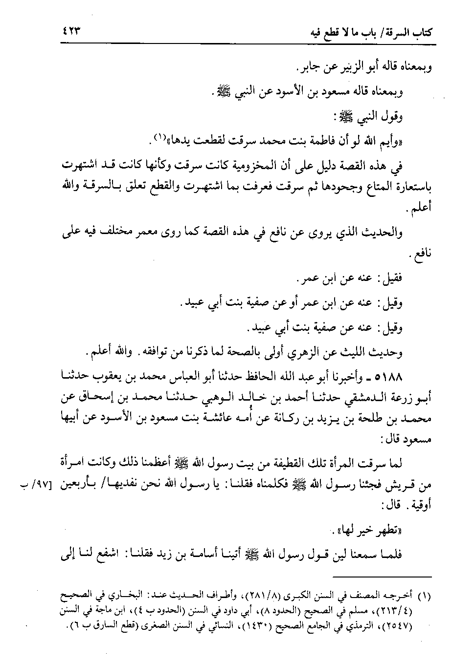 5188 - وأخبرنا أبو عبد الله الحافظ حدثنا أبو العباس محمد بن يعقوب حدثنا أبو زرعة الدمشقي حدثنا أحمد بن خالد الوهبي حدثنا محمد بن إسحاق عن محمد بن طلحة بن يزيد بن ركانة عن أُمه عائشة بنت مسعود بن الأسود عن أبيها مسعود قال : لما سرقت المرأة تلك القطيفة من بيت رسول الله صلى الله عليه وسلم أعظمنا ذلك وكانت امرأة من قريش فجئنا رسول الله صلى الله عليه وسلم فكلمناه فقلنا : يا رسول الله نحن نفديها بأربعين أوقية . قال : تظهر خير لها.