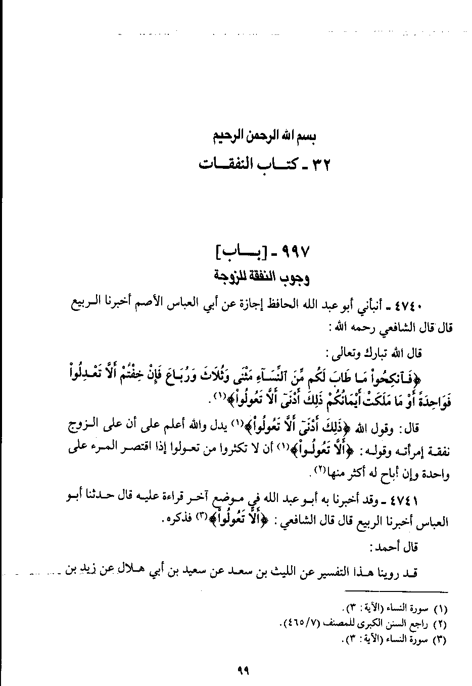 4740 - أنبأئي أبو عبد الله الحافظ إجازة عن أبي العباس الأصم أخبرنا الربيع قال قال الشافعي رحمه الله : قال الله تبارك وتعالى {فانكحوا ما طاب لكم من النساء مثنى وثلاث ورباع فإن خفتم ألا تعدلوا فواحدة أو ما ملكت أيمانكم ذلك أدنى ألا تعولوا} قال : وقول الله {ذلك أدنى ألا تعولوا} يدل والله أعلم على أن على الزوج نفقه إمرأته وقوله : {ألا تعولوا} أن لا تكثروا من تعولوا إذا اقتصر المرء على واحدة وإن أباح له أكثر منها.