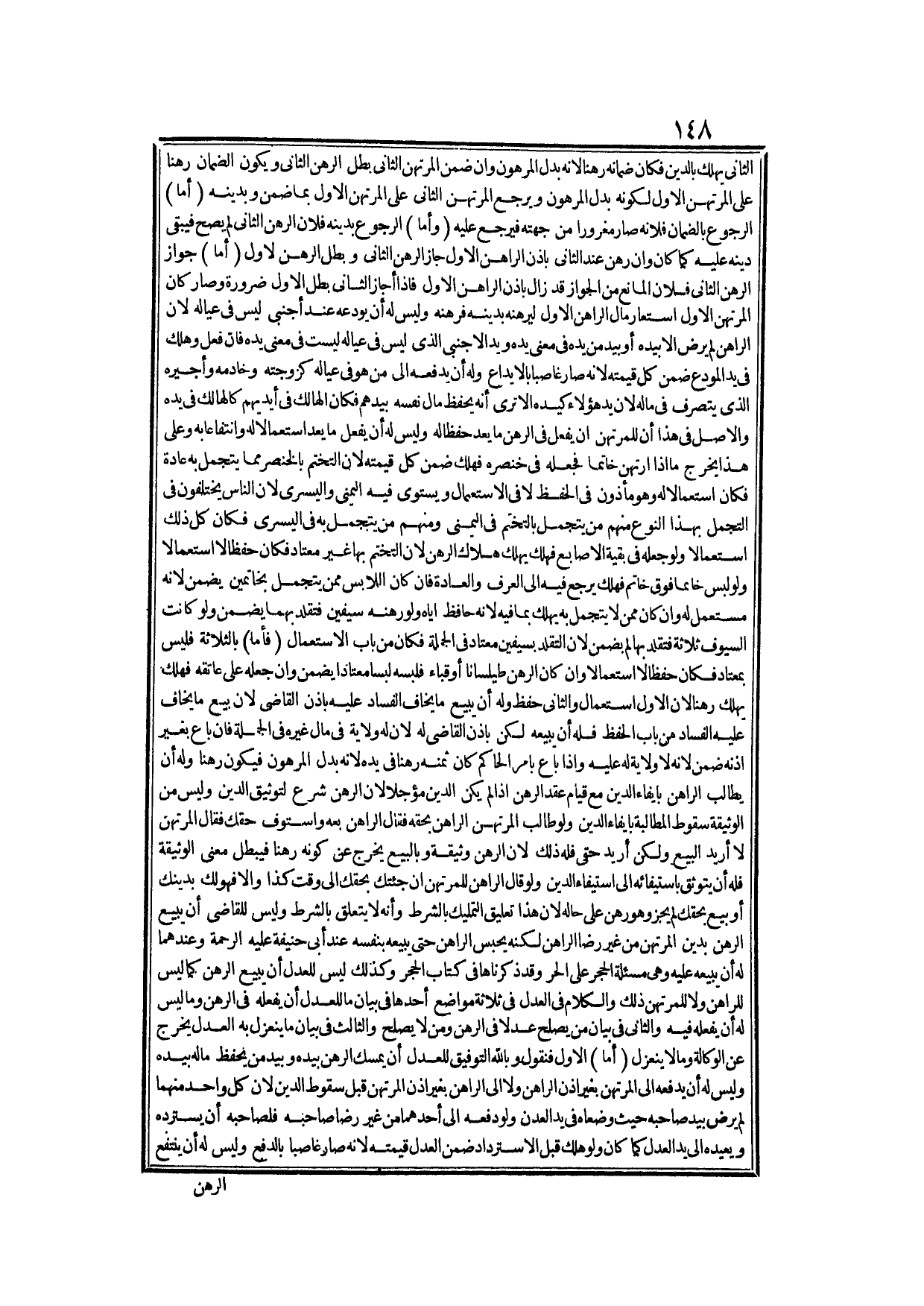 وَكَذَلِكَ لَيْسَ لِلْعَدْلِ أَنْ يَبِيعَ الرَّهْنَ، كَمَا لَيْسَ لِلرَّاهِنِ وَلَا لِلْمُرْتَهِنِ ذَلِكَ، وَالْكَلَامُ فِي الْعَدْلِ فِي ثَلَاثَةِ مَوَاضِعَ: أَحَدُهَا فِي بَيَانِ مَا لِلْعَدْلِ أَنْ يَفْعَلَهُ فِي الرَّهْنِ وَمَا لَيْسَ لَهُ أَنْ يَفْعَلَهُ فِيهِ.