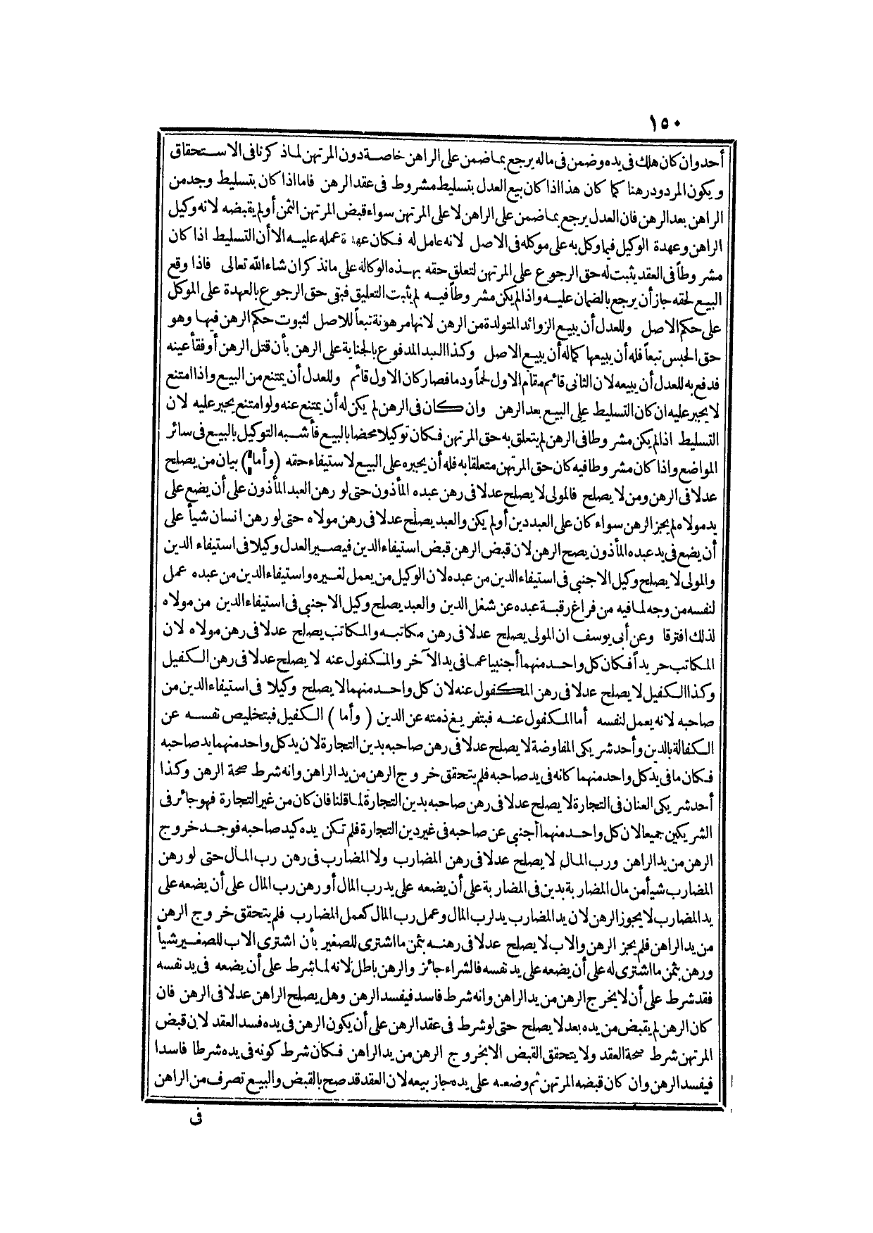 وَرَبُّ الْمَالِ لَا يَصْلُحُ عَدْلًا فِي رَهْنِ الْمُضَارِبِ وَلَا الْمُضَارِبُ فِي رَهْنِ رَبِّ الْمَالِ، حَتَّى لَوْ رَهَنَ الْمُضَارِبُ شَيْئًا مِنْ مَالِ الْمُضَارَبَةِ بِدَيْنٍ فِي الْمُضَارَبَةِ، عَلَى أَنْ يَضَعَهُ عَلَى يَدِ رَبِّ الْمَالِ، أَوْ رَهَنَ رَبُّ الْمَالِ عَلَى أَنْ يَضَعَهُ عَلَى يَدِ الْمُضَارِبِ لَا يَجُوزُ الرَّهْنُ؛؛ لِأَنَّ يَدَ الْمُضَارِبِ يَدٌ لِرَبِّ الْمَالِ، وَعَمَلُ رَبِّ الْمَالِ كَعَمَلِ الْمُضَارِبِ؛ فَلَمْ يَتَحَقَّقْ خُرُوجُ الرَّهْنِ مِنْ يَدِ الرَّاهِنِ؛ فَلَمْ يَجُزْ الرَّهْنُ وَالْأَبُ لَا يَصْلُحُ عَدْلًا فِي رَهْنِهِ بِثَمَنِ مَا اشْتَرَى لِلصَّغِيرِ، بِأَنْ اشْتَرَى الْأَبُ لِلصَّغِيرِ شَيْئًا، وَرَهَنَ بِثَمَنِ مَا اشْتَرَى لَهُ عَلَى أَنْ يَضَعَهُ عَلَى يَدِ نَفَسِهِ فَالشِّرَاءُ جَائِزٌ وَالرَّهْنُ بَاطِلٌ؛؛ لِأَنَّهُ لَمَّا شَرَطَ عَلَى أَنْ يَضَعَهُ فِي يَدِ نَفَسِهِ، فَقَدْ شَرَطَ عَلَى أَنْ لَا يَخْرُجَ الرَّهْنُ مِنْ يَدِ الرَّاهِنِ، وَإِنَّهُ شَرْطٌ فَاسِدٌ؛ فَيَفْسُدُ الرَّهْنُ، وَهَلْ يَصْلُحُ الرَّاهِنُ عَدْلًا فِي الرَّهْنِ؟ فَإِنْ كَانَ الرَّهْنُ لَمْ يُقْبَضْ مِنْ يَدِهِ بَعْدُ، لَا يَصْلُحُ، حَتَّى لَوْ شَرَطَ فِي عَقْدِ الرَّهْنِ عَلَى أَنْ يَكُونَ الرَّهْنُ فِي يَدِهِ، فَسَدَ الْعَقْدُ؛؛ لِأَنَّ قَبْضَ الْمُرْتَهِنِ شَرْطُ صِحَّةِ الْعَقْدِ، وَلَا يَتَحَقَّقُ الْقَبْضُ إلَّا بِخُرُوجِ الرَّهْنِ مِنْ يَدِ الرَّاهِنِ، فَكَانَ شَرْطُ كَوْنِهِ فِي يَدِهِ شَرْطًا فَاسِدًا فَيَفْسُدُ الرَّهْنُ، وَإِنْ كَانَ قَبَضَهُ الْمُرْتَهِنُ ثُمَّ وَضَعَهُ عَلَى يَدِهِ، جَازَ بَيْعُهُ؛؛ لِأَنَّ الْعَقْدَ قَدْ صَحَّ بِالْقَبْضِ، وَالْبَيْعُ تَصَرُّفٌ مِنْ الرَّاهِنِ