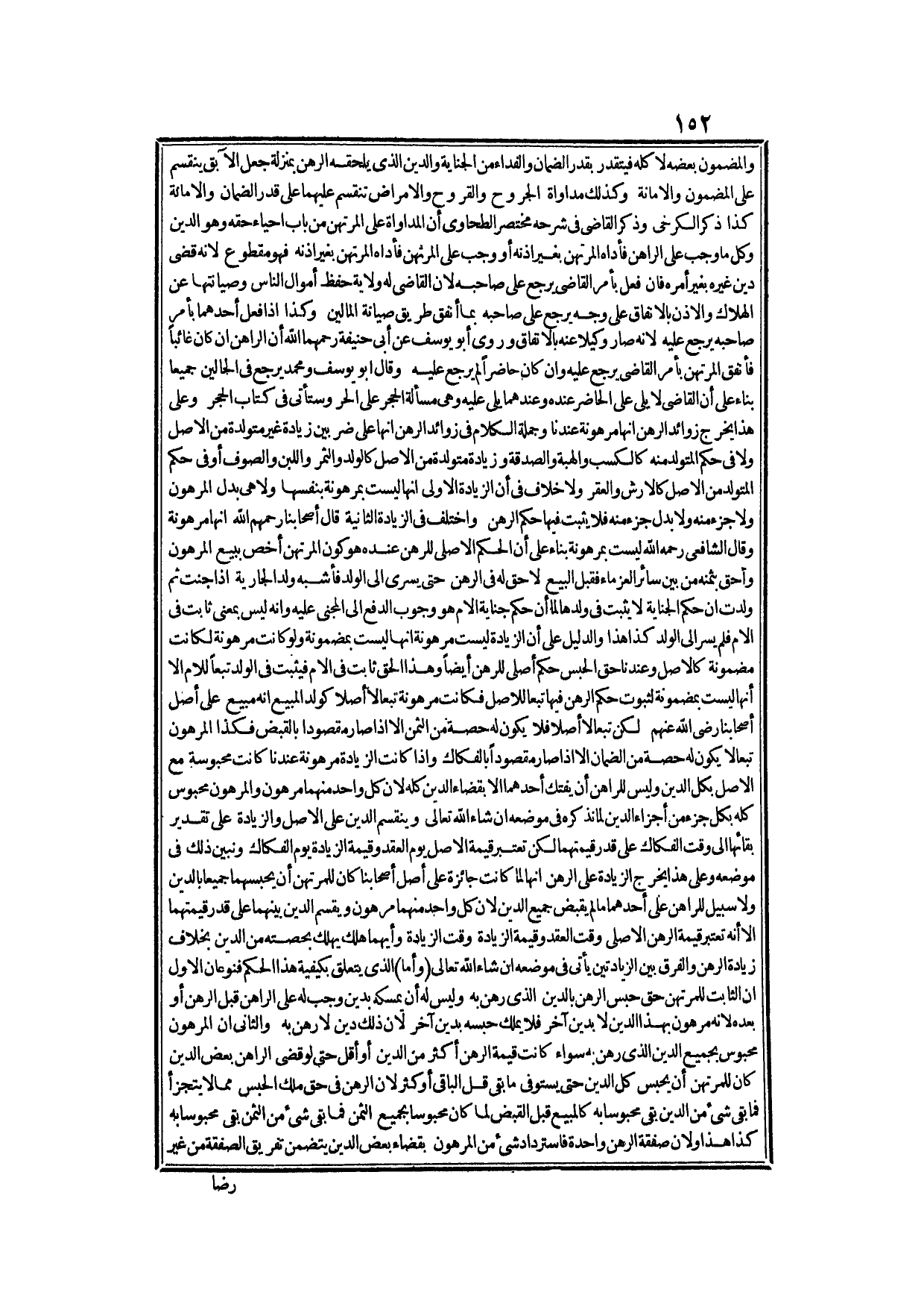 وَالثَّانِي أَنَّ الْمَرْهُونَ مَحْبُوسٌ بِجَمِيعِ الدَّيْنِ الَّذِي رَهَنَ بِهِ، سَوَاءٌ كَانَتْ قِيمَةُ الرَّهْنِ أَكْثَرَ مِنْ الدَّيْنِ أَوْ أَقَلَّ، حَتَّى لَوْ قَضَى الرَّاهِنُ بَعْضَ الدَّيْنِ، كَانَ لِلْمُرْتَهِنِ أَنْ يَحْبِسَ كُلَّ الرَّهْنِ، حَتَّى يَسْتَوْفِيَ مَا بَقِيَ، قَلَّ الْبَاقِي أَوْ كَثُرَ؛ لِأَنَّ الرَّهْنَ فِي حَقِّ مِلْكِ الْحَبْسِ مِمَّا لَا يَتَجَزَّأُ، فَمَا بَقِيَ شَيْءٌ مِنْ الدَّيْنِ بَقِيَ مَحْبُوسًا بِهِ، كَالْمَبِيعِ قَبْلَ الْقَبْضِ لَمَّا كَانَ مَحْبُوسًا بِجَمِيعِ الثَّمَنِ فَمَا بَقِيَ شَيْءٌ مِنْ الثَّمَنِ بَقِيَ مَحْبُوسًا بِهِ كَذَا هَذَا؛ وَلِأَنَّ صَفْقَةَ الرَّهْنِ وَاحِدَةٌ فَاسْتِرْدَادُ شَيْءٍ مِنْ الْمَرْهُونِ بِقَضَاءِ بَعْضِ الدَّيْنِ يَتَضَمَّنُ تَفْرِيقَ الصَّفْقَةِ مِنْ غَيْرِ رِضَا