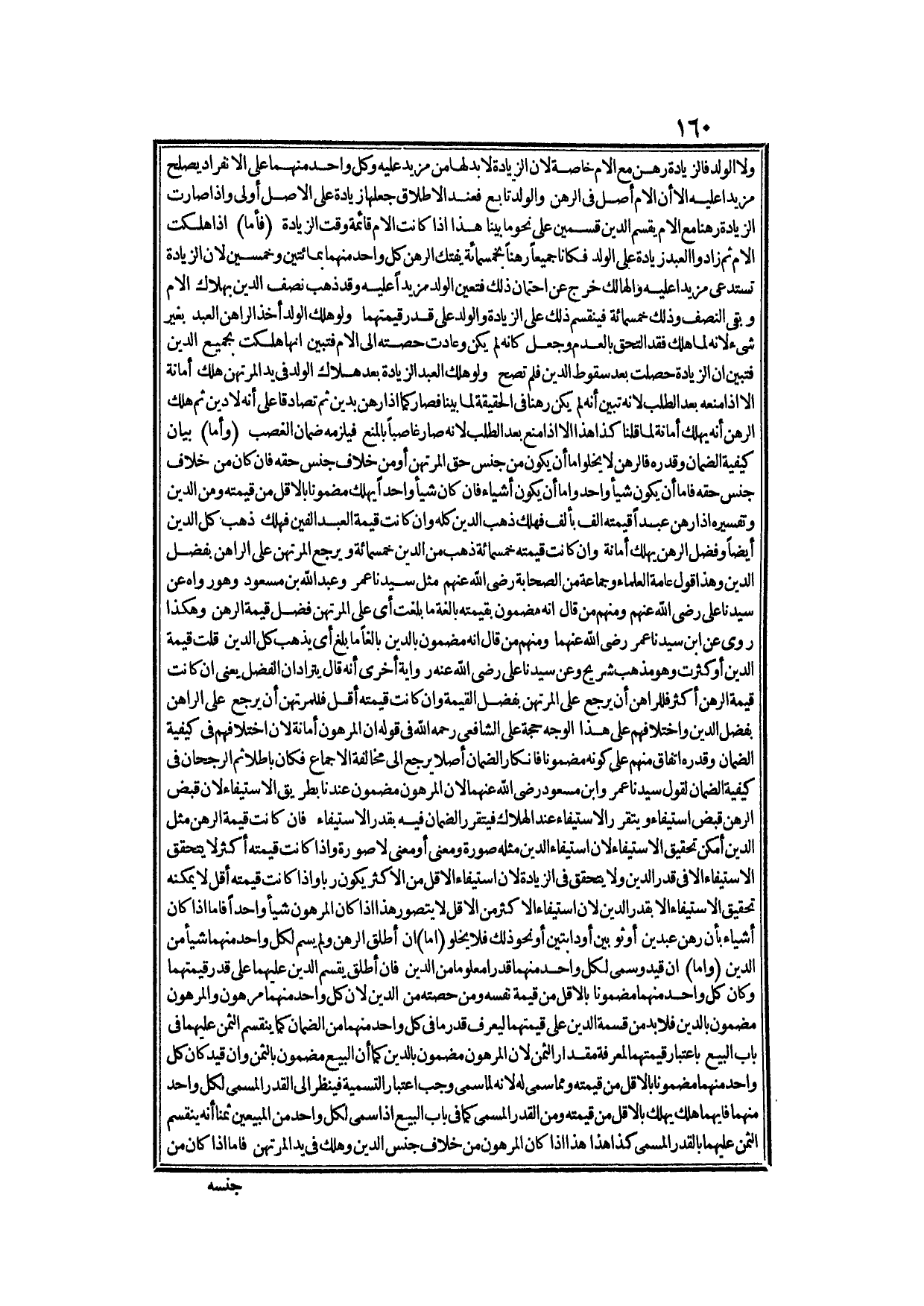 وَهَكَذَا رُوِيَ عَنْ ابْنِ سَيِّدِنَا عُمَرَ - رَضِيَ اللَّهُ عَنْهُمَا -، وَمِنْهُمْ مَنْ قَالَ: إنَّهُ مَضْمُونٌ بِالدَّيْنِ بَالِغًا مَا بَلَغَ، أَيْ يَذْهَبُ كُلُّ الدَّيْنِ قَلَّتْ قِيمَةُ الدَّيْنِ أَوْ كَثُرَتْ وَهُوَ مَذْهَبُ شُرَيْحٍ وَعَنْ سَيِّدِنَا عَلِيٍّ رِوَايَةٌ أُخْرَى أَنَّهُ قَالَ: يَتَرَادَّانِ الْفَضْلَ يَعْنِي إنْ كَانَتْ قِيمَةُ الرَّهْنِ أَكْثَرَ فَلِلرَّاهِنِ أَنْ يَرْجِعَ عَلَى الْمُرْتَهِنِ بِفَضْلِ الْقِيمَةِ، وَإِنْ كَانَتْ قِيمَتُهُ أَقَلَّ، فَلِلْمُرْتَهِنِ أَنْ يَرْجِعَ عَلَى الرَّاهِنِ بِفَضْلِ الدَّيْنِ.