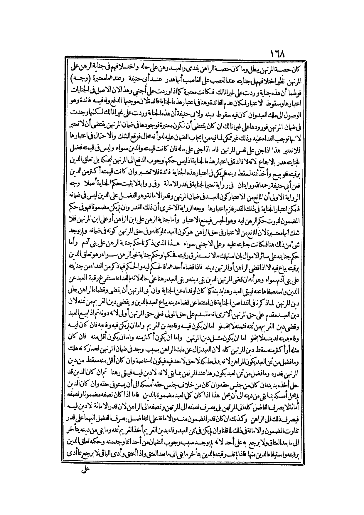 كَانَ حِصَّةَ الْمُرْتَهِنِ يَبْطُلُ وَمَا كَانَ حِصَّةَ الرَّاهِنِ يُفْدَى، وَالْعَبْدُ رَهْنٌ عَلَى حَالِهِ، وَاخْتِلَافُهُمْ فِي جِنَايَةِ الرَّهْنِ عَلَى الْمُرْتَهِنِ نَظِيرُ اخْتِلَافِهِمْ فِي جِنَايَتِهِ عِنْدَ الْغَصْبِ عَلَى الْغَاصِبِ أَنَّهَا هَدَرٌ عِنْدَ أَبِي حَنِيفَةَ، وَعِنْدَهُمَا مُعْتَبَرَةٌ.