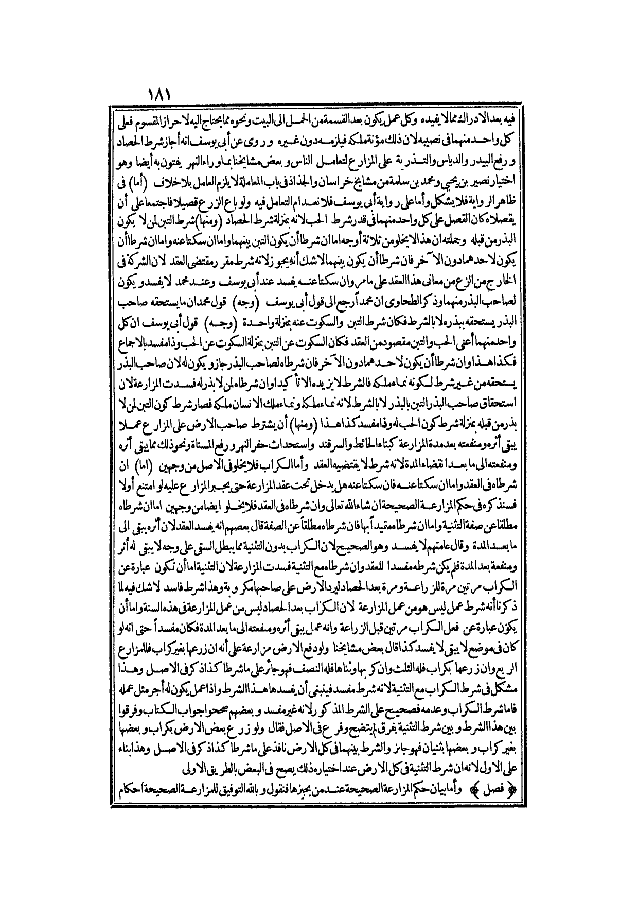 وَرُوِيَ عَنْ أَبِي يُوسُفَ أَنَّهُ أَجَازَ شَرْطَ الْحَصَادِ وَرَفْعِ الْبَيْدَرِ وَالدِّيَاسِ وَالتَّذْرِيَةِ عَلَى الْمُزَارِعِ لِتَعَامُلِ النَّاسِ، وَبَعْضُ مَشَايِخِنَا بِمَا وَرَاءَ النَّهْرِ يُفْتُونَ بِهِ أَيْضًا، وَهُوَ اخْتِيَارُ نُصَيْرِ بْنِ يَحْيَى وَمُحَمَّدِ بْنِ سَلَمَةَ مِنْ مَشَايِخِ خُرَاسَانَ