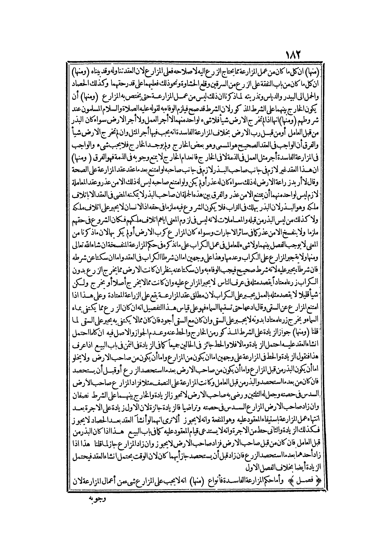 مِنْهَا) : أَنَّ كُلَّ مَا كَانَ مِنْ عَمَلِ الْمُزَارَعَةِ مِمَّا يُحْتَاجُ إلَيْهِ لِإِصْلَاحِهِ فَعَلَى الْمُزَارِعِ؛ لِأَنَّ الْعَقْدَ تَنَاوَلَهُ وَقَدْ بَيَّنَّاهُ.