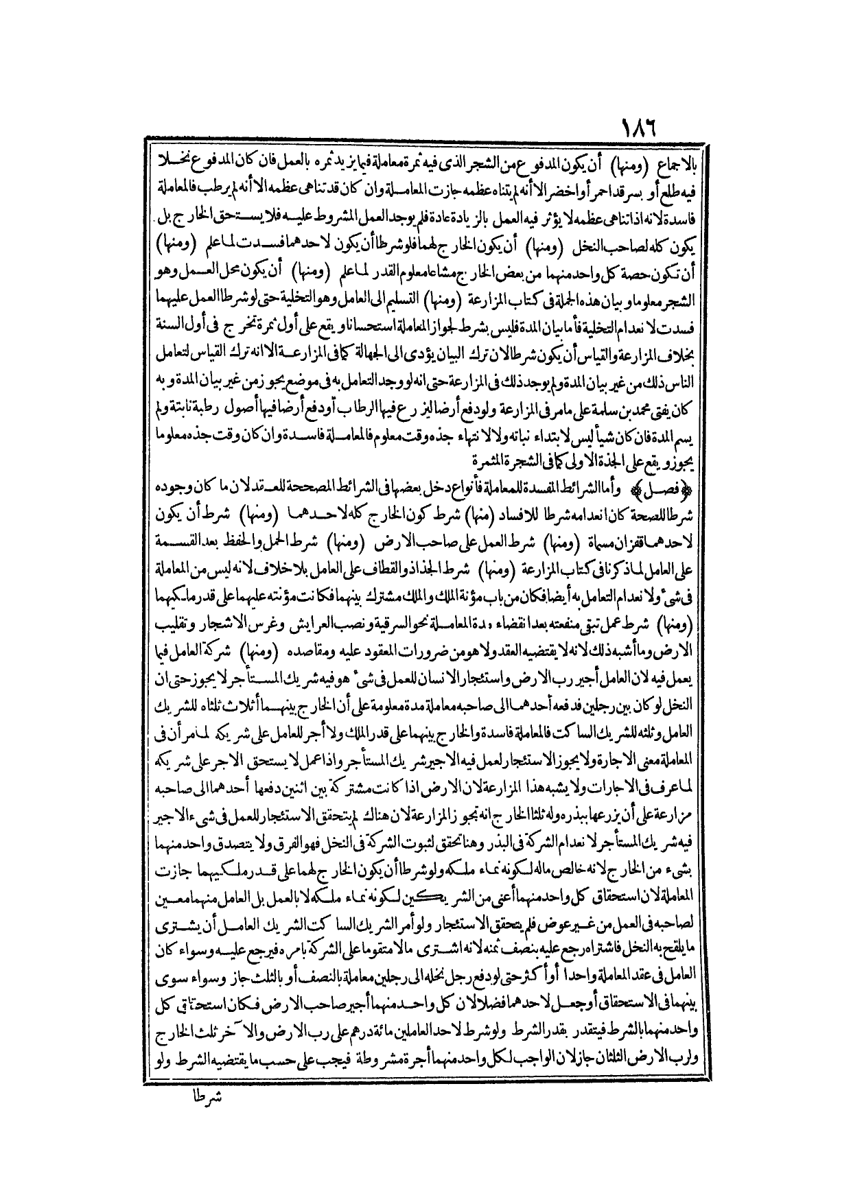 (مِنْهَا) شَرْطُ كَوْنِ الْخَارِجِ كُلِّهِ لِأَحَدِهِمَا (وَمِنْهَا) شَرْطُ أَنْ يَكُونَ لِأَحَدِهِمَا قُفْزَانٌ مُسَمَّاةٌ (وَمِنْهَا) شَرْطُ الْعَمَلِ عَلَى صَاحِبِ الْأَرْضِ.
