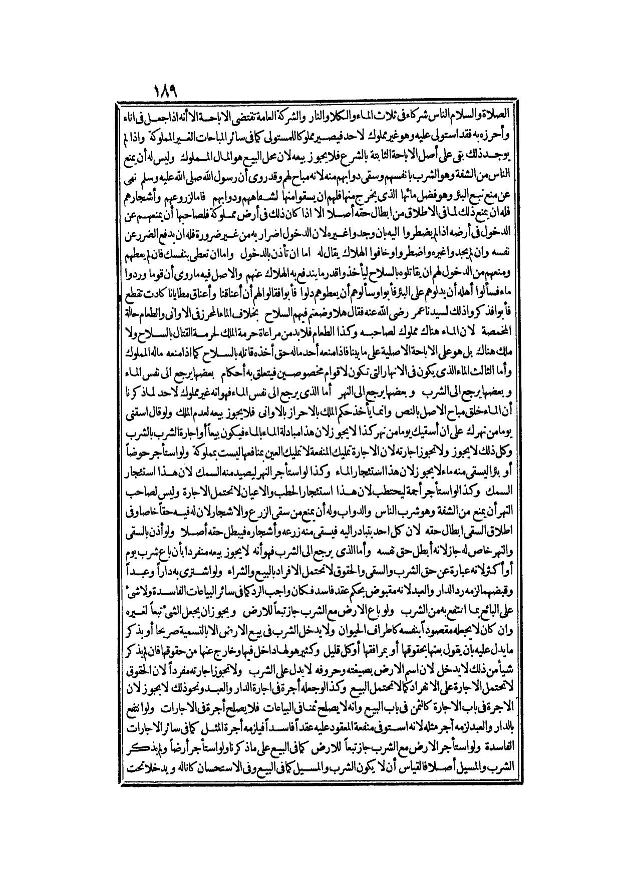 بِخِلَافِ الْمَاءِ الْمُحْرَزِ فِي الْأَوَانِي وَالطَّعَامِ حَالَةَ الْمَخْمَصَةِ؛ لِأَنَّ الْمَاءَ هُنَاكَ مَمْلُوكٌ لِصَاحِبِهِ وَكَذَا الطَّعَامُ فَلَا بُدَّ مِنْ مُرَاعَاةِ حُرْمَةِ الْمِلْكِ لِحُرْمَةِ الْقِتَالِ بِالسِّلَاحِ، وَلَا مِلْكَ هُنَاكَ بَلْ هُوَ عَلَى الْإِبَاحَةِ الْأَصْلِيَّةِ عَلَى مَا بَيَّنَّا، فَإِذَا مَنَعَهُ أَحَدٌ مَا لَهُ حَقُّ أَخْذِهِ قَاتَلَهُ بِالسِّلَاحِ كَمَا إذَا مَنَعَهُ مَالَهُ الْمَمْلُوكَ وَأَمَّا الثَّالِثُ: الْمَاءُ الَّذِي يَكُونُ فِي الْأَنْهَارِ الَّتِي تَكُونُ لِأَقْوَامٍ مَخْصُوصِينَ فَيَتَعَلَّقُ بِهِ أَحْكَامٌ بَعْضُهَا يَرْجِعُ إلَى نَفْسِ الْمَاءِ، وَبَعْضُهَا يَرْجِعُ إلَى الشِّرْبِ، وَبَعْضُهَا يَرْجِعُ إلَى النَّهْرِ.
