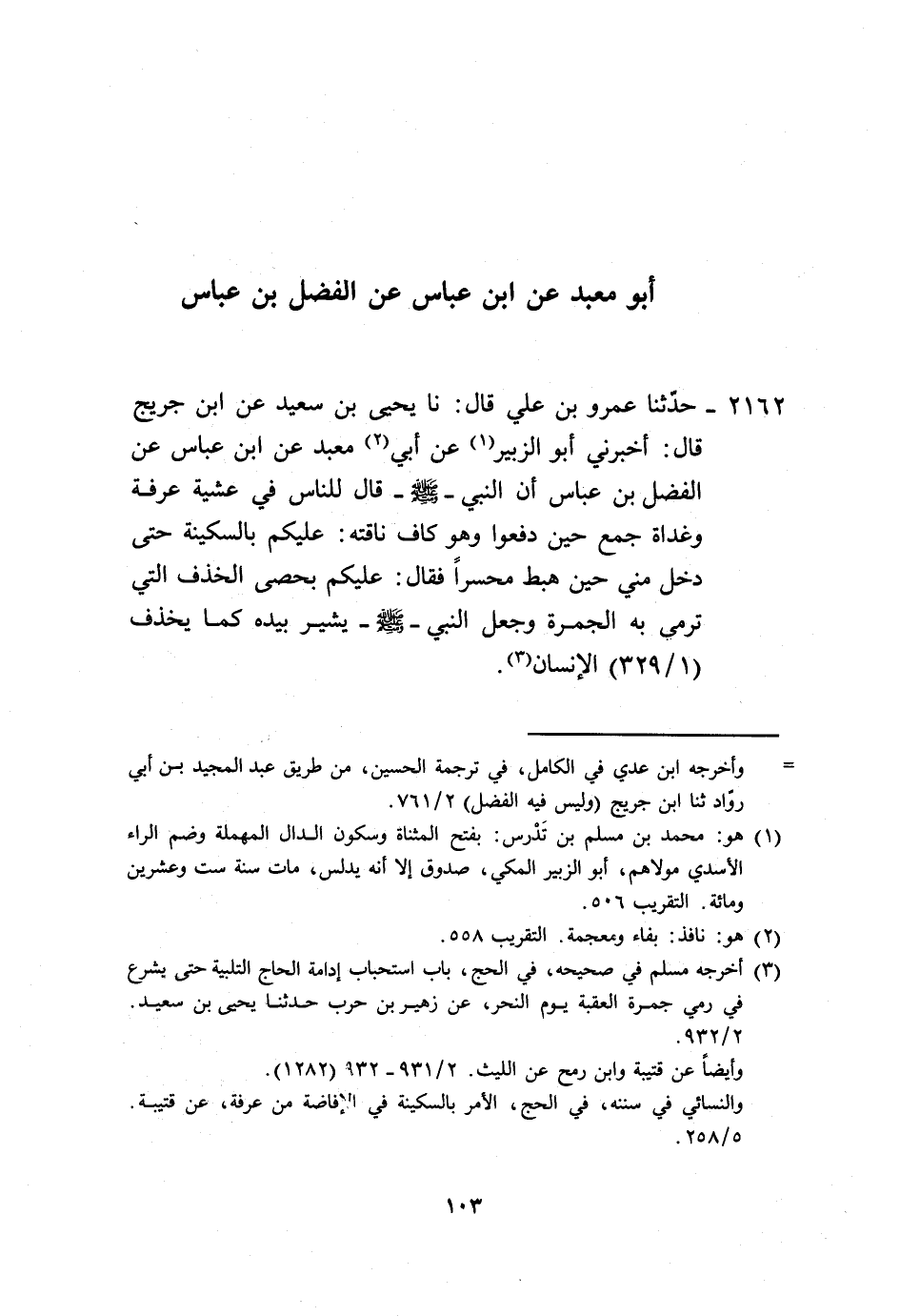 2162 - حَدَّثَنَا عَمْرُو بْنُ عَلِيٍّ، قَالَ: نا يَحْيَى بْنُ سَعِيدٍ، عَنِ ابْنِ جُرَيْجٍ، قَالَ: أَخْبَرَنِي أَبُو الزُّبَيْرِ، عَنْ أَبِي مَعْبَدٍ، عَنِ ابْنِ عَبَّاسٍ، عَنِ الْفَضْلِ بْنِ عَبَّاسٍ، أَنَّ النَّبِيَّ صَلَّى اللهُ عَلَيْهِ وَسَلَّمَ قَالَ لِلنَّاسِ فِي عَشِيَّةِ عَرَفَةَ وَغَدَاةَ جَمْعٍ حِينَ دَفَعُوا وَهُوَ كَافٌّ نَاقَتَهُ: «عَلَيْكُمْ بِالسَّكِينَةِ» حَتَّى دَخَلَ مِنًى حِينَ هَبَطَ مُحَسِّرًا، فَقَالَ: «§عَلَيْكُمْ بِحَصَى الْخَذْفِ الَّتِي تُرْمَى بِهِ الْجَمْرَةُ» وَجَعَلَ النَّبِيُّ صَلَّى اللهُ عَلَيْهِ وَسَلَّمَ يُشِيرُ بِيَدِهِ كَمَا يَخْذِفُ الْإِنْسَانُ