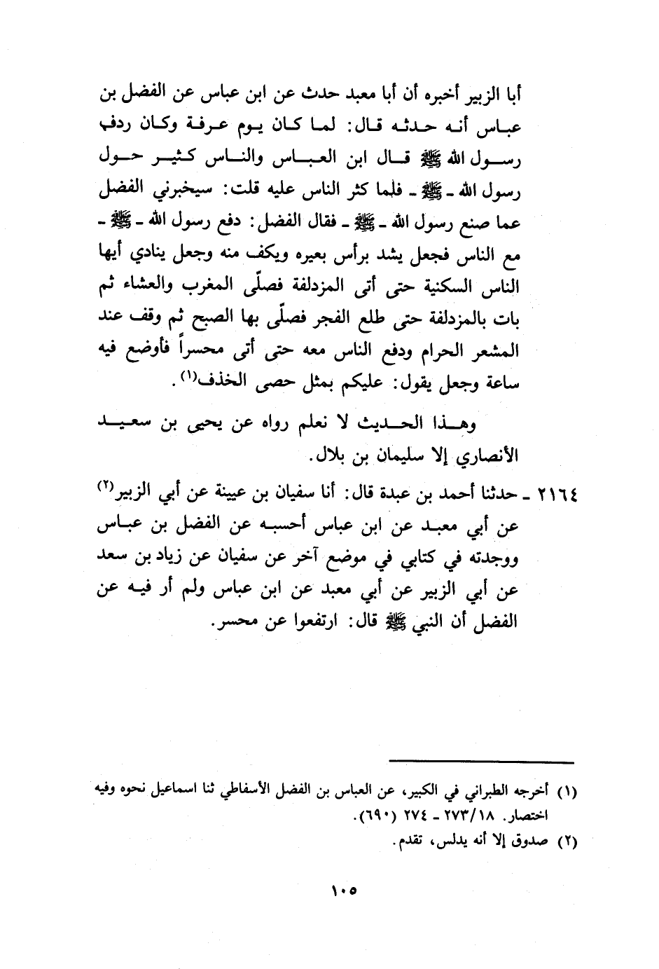 2164 - حَدَّثَنَا أَحْمَدُ بْنُ عَبْدَةَ، قَالَ: أنا سُفْيَانُ بْنُ عُيَيْنَةَ، عَنْ أَبِي الزُّبَيْرِ، عَنْ أَبِي مَعْبَدٍ، عَنِ ابْنِ عَبَّاسٍ، أَحْسِبُهُ عَنِ الْفَضْلِ بْنِ عَبَّاسٍ، وَوَجَدْتُهُ فِي كِتَابِي فِي مَوْضِعٍ آخَرَ، عَنْ سُفْيَانَ، عَنْ زِيَادِ بْنِ سَعْدٍ، عَنْ أَبِي الزُّبَيْرِ، عَنْ أَبِي مَعْبَدٍ، عَنِ ابْنِ عَبَّاسٍ وَلَمْ أَرَ فِيهِ، عَنِ الْفَضْلِ أَنَّ النَّبِيَّ صَلَّى اللهُ عَلَيْهِ وَسَلَّمَ قَالَ: «§ارْتَفِعُوا عَنْ مُحَسِّرٍ»