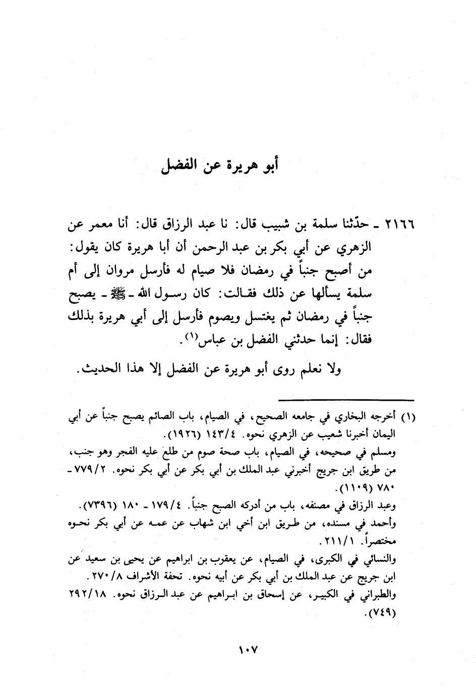 2166 - حَدَّثَنَا سَلَمَةُ بْنُ شَبِيبٍ، قَالَ: نا عَبْدُ الرَّزَّاقِ، قَالَ: أنا مَعْمَرٌ، عَنِ الزُّهْرِيِّ، عَنْ أَبِي بَكْرِ بْنِ عَبْدِ الرَّحْمَنِ، أَنَّ أَبَا هُرَيْرَةَ، كَانَ يَقُولُ: مَنْ أَصْبَحَ جُنُبًا فِي رَمَضَانَ فَلَا صِيَامَ لَهُ، فَأَرْسَلَ مَرْوَانُ، إِلَى أُمِّ سَلَمَةَ يَسْأَلُهَا، عَنْ ذَلِكَ، فَقَالَتْ: «كَانَ رَسُولُ اللَّهِ صَلَّى اللهُ عَلَيْهِ وَسَلَّمَ §يُصْبِحُ جُنُبًا فِي رَمَضَانَ، ثُمَّ يَغْتَسِلُ وَيَصُومُ» فَأَرْسَلَ إِلَى أَبِي هُرَيْرَةَ، بِذَلِكَ فَقَالَ: إِنَّمَا حَدَّثَنِي الْفَضْلُ بْنُ عَبَّاسٍ. وَلَا نَعْلَمُ رَوَى أَبُو هُرَيْرَةَ، عَنِ الْفَضْلِ إِلَّا هَذَا الْحَدِيثَ