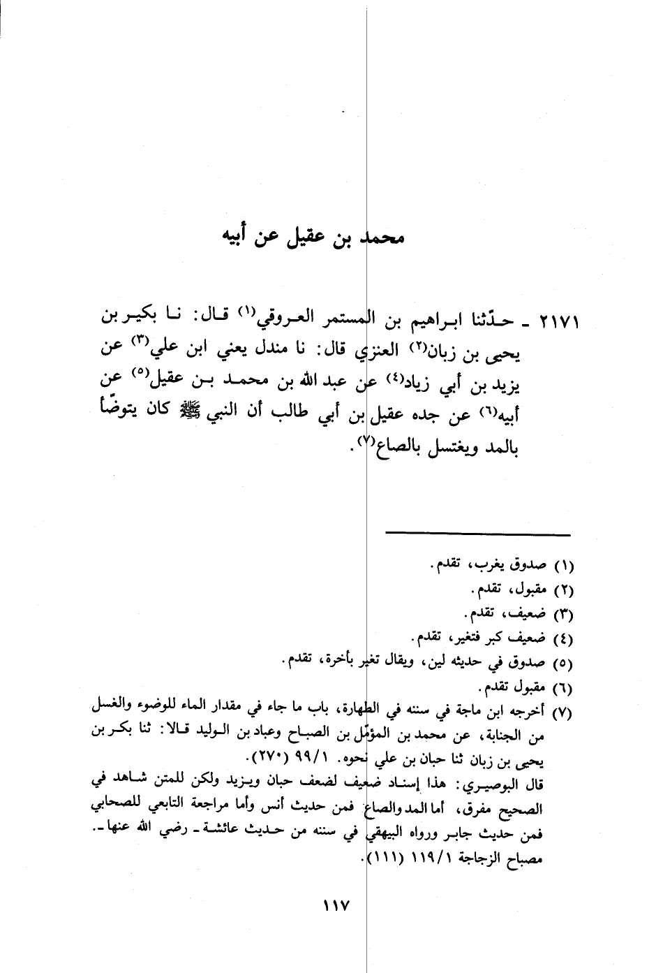 2171 - حَدَّثَنَا إِبْرَاهِيمُ بْنُ الْمُسْتَمِرِّ الْعُرُوقِيُّ، قَالَ: نا بُكَيْرُ بْنُ يَحْيَى بْنِ زَبَّانَ الْعَنَزِيُّ، قَالَ: حَدَّثَنَا مِنْدَلٌ يَعْنِي ابْنَ عَلِيٍّ، عَنْ يَزِيدَ بْنِ أَبِي زِيَادٍ، عَنْ عَبْدِ اللَّهِ بْنِ مُحَمَّدِ بْنِ عَقِيلٍ، عَنْ أَبِيهِ، عَنْ جَدِّهِ عَقِيلِ بْنِ أَبِي طَالِبٍ، «أَنَّ النَّبِيَّ صَلَّى اللهُ عَلَيْهِ وَسَلَّمَ كَانَ §يَتَوَضَّأُ بِالْمُدِّ وَيَغْتَسِلُ بِالصَّاعِ» -[118]-. وَهَذَا الْحَدِيثُ لَا نَعْلَمُهُ يُرْوَى، عَنْ عَقِيلٍ إِلَّا مِنْ هَذَا الْوَجْهِ وَهَذَا الْحَدِيثُ أَخْطَأَ فِيهِ مِنْدَلٌ إِذْ جَعَلَهُ بِهَذَا الْإِسْنَادِ. وَإِنَّمَا رَوَاهُ يَزِيدُ بْنُ أَبِي زِيَادٍ، عَنْ سَالِمِ بْنِ أَبِي الْجَعْدِ، عَنْ جَابِرِ بْنِ عَبْدِ اللَّهِ