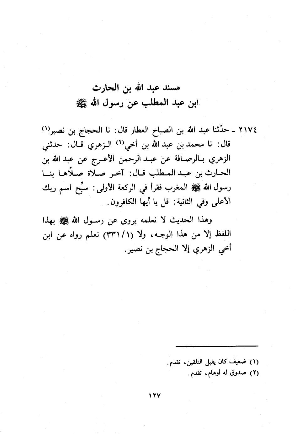 2174 - اللَّهِ بْنُ الصَّبَّاحِ الْعَطَّارُ، قَالَ: نا الْحَجَّاجُ بْنُ نُصَيْرٍ، قَالَ: نا مُحَمَّدُ بْنُ عَبْدِ اللَّهِ ابْنِ أَخِي الزُّهْرِيِّ، قَالَ: حَدَّثَنِي الزُّهْرِيُّ، بِالرَّصَافَةِ، عَنْ عَبْدِ الرَّحْمَنِ الْأَعْرَجِ، عَنْ عَبْدِ اللَّهِ بْنِ الْحَارِثِ بْنِ عَبْدِ الْمُطَّلِبِ، قَالَ: «§آخِرُ صَلَاةٍ صَلَّاهَا بِنَا رَسُولُ اللَّهِ صَلَّى اللهُ عَلَيْهِ وَسَلَّمَ الْمَغْرِبُ فَقَرَأَ فِي الرَّكْعَةِ الْأُولَى سَبِّحِ اسْمَ رَبِّكَ الْأَعْلَى، وَفِي الثَّانِيَةِ قُلْ يَا أَيُّهَا الْكَافِرُونُ» . وَهَذَا الْحَدِيثُ لَا نَعْلَمُهُ يُرْوَى عَنْ رَسُولِ اللَّهِ صَلَّى اللهُ عَلَيْهِ وَسَلَّمَ بِهَذَا اللَّفْظِ إِلَّا مِنْ هَذَا الْوَجْهِ وَلَا نَعْلَمُ رَوَاهُ عَنِ ابْنِ أَخِي الزُّهْرِيِّ، إِلَّا الْحَجَّاجُ بْنُ نُصَيْرٍ