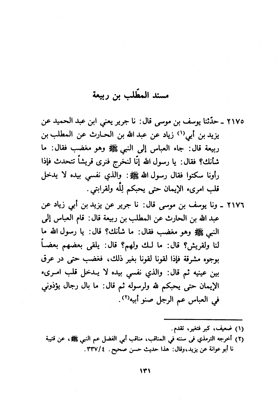 2175 - حَدَّثَنَا يُوسُفُ بْنُ مُوسَى، قَالَ: نا جَرِيرٌ يَعْنِي ابْنَ عَبْدِ الْحَمِيدِ، عَنْ يَزِيدَ بْنِ أَبِي زِيَادٍ، عَنْ عَبْدِ اللَّهِ بْنِ الْحَارِثِ، عَنِ الْمُطَّلِبِ بْنِ رَبِيعَةَ، قَالَ: جَاءَ الْعَبَّاسُ، إِلَى النَّبِيِّ صَلَّى اللهُ عَلَيْهِ وَسَلَّمَ وَهُوَ مُغْضَبٌ، فَقَالَ: «مَا شَأْنُكَ؟» فَقَالَ: يَا رَسُولَ اللَّهِ إِنَّا لَنَخْرُجُ فَنَرَى قُرَيْشًا تَتَحَدَّثُ فَإِذَا رَأَوْنَا سَكَتُوا، فَقَالَ رَسُولُ اللَّهِ صَلَّى اللهُ عَلَيْهِ وَسَلَّمَ: «§وَالَّذِي نَفْسِي بِيَدِهِ لَا يَدْخُلُ قَلْبَ امْرِئٍ الْإِيمَانُ حَتَّى يُحِبَّكُمْ لِلَّهِ وَلِقَرَابَتِي»