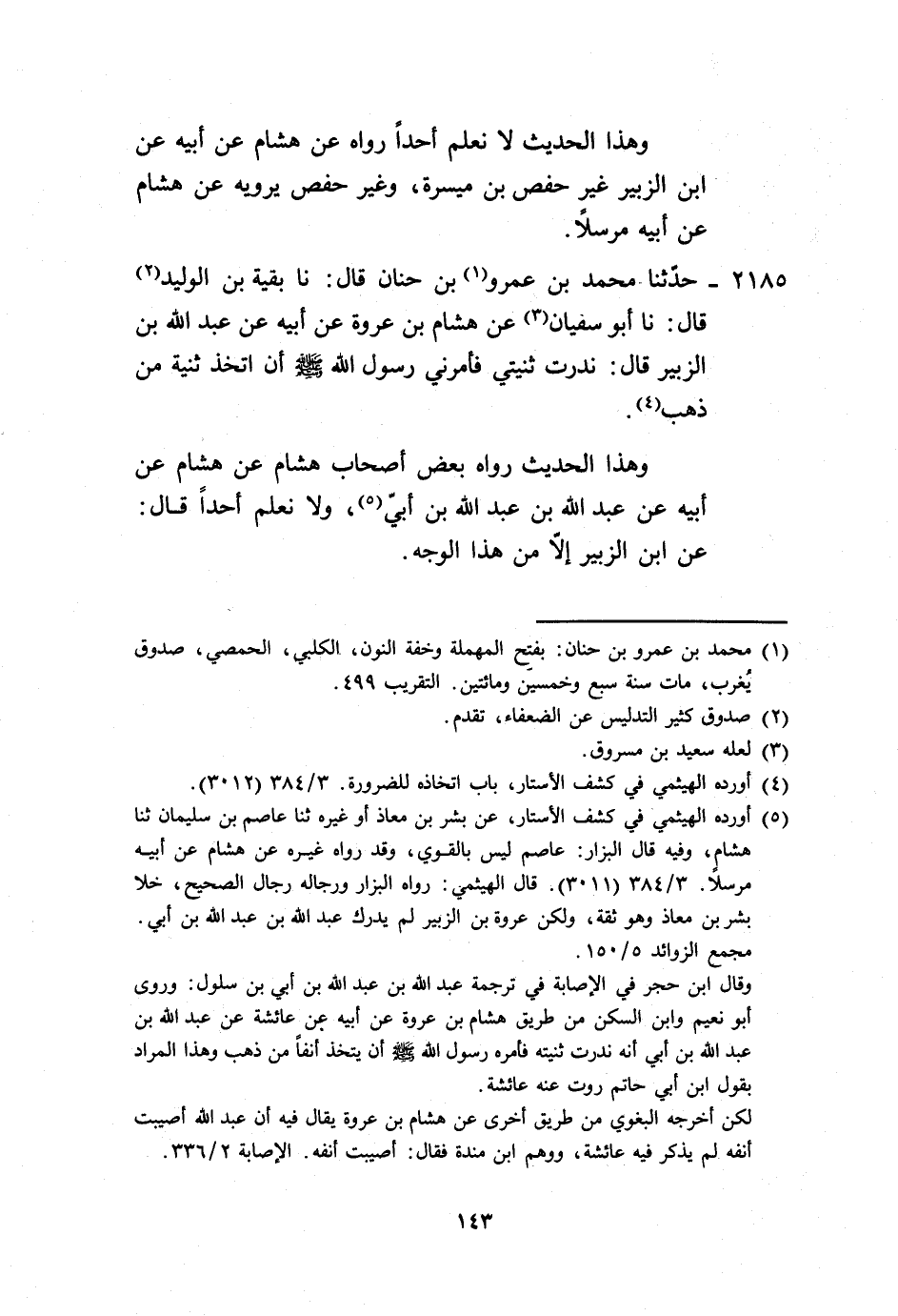 2185 - حَدَّثَنَا مُحَمَّدُ بْنُ عَمْرِو بْنِ حَنَّانٍ، قَالَ: نا بَقِيَّةُ بْنُ الْوَلِيدِ، قَالَ: نا أَبُو سُفْيَانَ، عَنْ هِشَامِ بْنِ عُرْوَةَ، عَنْ أَبِيهِ، عَنْ عَبْدِ اللَّهِ بْنِ الزُّبَيْرِ، قَالَ: «نَدَرَتْ ثَنِيَّتِي §فَأَمَرَنِي رَسُولُ اللَّهِ صَلَّى اللهُ عَلَيْهِ وَسَلَّمَ أَنْ أَتَّخِذَ ثَنِيَّةً مِنْ ذَهَبٍ» . وَهَذَا الْحَدِيثُ رَوَاهُ بَعْضُ أَصْحَابِ هِشَامٍ، عَنْ هِشَامٍ، عَنْ أَبِيهِ، عَنْ عَبْدِ اللَّهِ بْنِ عَبْدِ اللَّهِ بْنِ أُبَيٍّ، وَلَا نَعْلَمُ أَحَدًا قَالَ: عَنِ ابْنِ الزُّبَيْرِ إِلَّا مِنْ هَذَا الْوَجْهِ