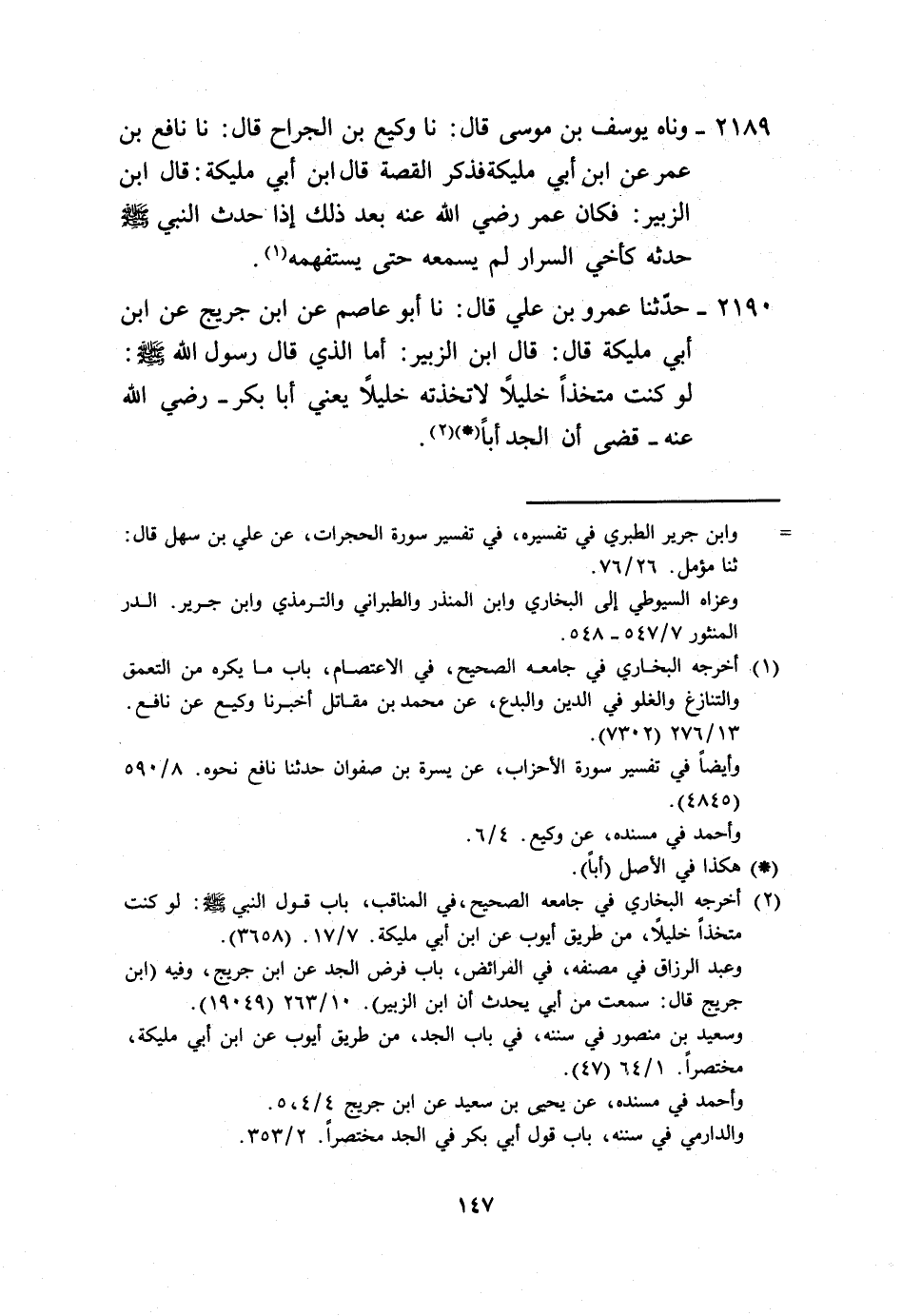 2190 - حَدَّثَنَا عَمْرُو بْنُ عَلِيٍّ، قَالَ: نا أَبُو عَاصِمٍ، عَنِ ابْنِ جُرَيْجٍ، عَنِ ابْنِ أَبِي مُلَيْكَةَ، قَالَ: قَالَ ابْنُ الزُّبَيْرِ: أَمَّا الَّذِي قَالَ رَسُولُ اللَّهِ صَلَّى اللهُ عَلَيْهِ وَسَلَّمَ: «§لَوْ كُنْتُ مُتَّخِذًا خَلِيلًا لَاتَّخَذْتُهُ خَلِيلًا - يَعْنِي أَبَا بَكْرٍ رَضِيَ اللَّهُ عَنْهُ - قَضَى أَنَّ الْجَدَّ أَبٌ» -[148]-. وَهَذَا الْكَلَامُ قَدْ رُوِيَ، عَنِ ابْنِ الزُّبَيْرِ، مِنْ غَيْرِ وَجْهٍ