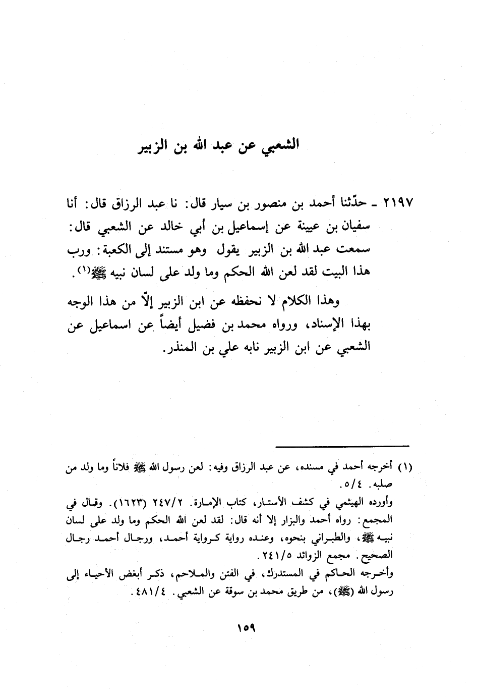 2197 - حَدَّثَنَا أَحْمَدُ بْنُ مَنْصُورِ بْنِ سَيَّارٍ، قَالَ: نا عَبْدُ الرَّزَّاقِ، قَالَ: أنا سُفْيَانُ بْنُ عُيَيْنَةَ، عَنْ إِسْمَاعِيلَ بْنِ أَبِي خَالِدٍ، عَنِ الشَّعْبِيِّ، قَالَ: سَمِعْتُ عَبْدَ اللَّهِ بْنَ الزُّبَيْرِ، يَقُولُ وَهُوَ مُسْتَنِدٌ إِلَى الْكَعْبَةِ: «وَرَبِّ هَذَا الْبَيْتِ §لَقَدْ لَعَنَ اللَّهُ الْحَكَمَ وَمَا وَلَدَ عَلَى لِسَانِ نَبِيِّهِ» . وَهَذَا الْكَلَامُ لَا نَحْفَظُهُ عَنِ ابْنِ الزُّبَيْرِ إِلَّا مِنْ هَذَا الْوَجْهِ بِهَذَا الْإِسْنَادِ. وَرَوَاهُ مُحَمَّدُ بْنُ فُضَيْلٍ، أَيْضًا عَنْ إِسْمَاعِيلَ، عَنِ الشَّعْبِيِّ، عَنِ ابْنِ الزُّبَيْرِ، نَا بِهِ عَلِيُّ بْنُ الْمُنْذِرِ