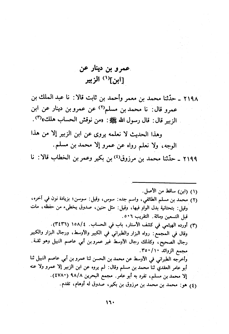 2198 - حَدَّثَنَا مُحَمَّدُ بْنُ مَعْمَرٍ، وَأَحْمَدُ بْنُ ثَابِتٍ، قَالَا: نا عَبْدُ الْمَلِكِ بْنُ عَمْرٍو، قَالَ: نا مُحَمَّدُ بْنُ مُسْلِمٍ، عَنْ عَمْرِو بْنِ دِينَارٍ، عَنِ ابْنِ الزُّبَيْرِ، قَالَ: قَالَ رَسُولُ اللَّهِ صَلَّى اللهُ عَلَيْهِ وَسَلَّمَ: «§مَنْ نُوقِشَ الْحِسَابَ هَلَكَ» . وَهَذَا الْحَدِيثُ لَا نَعْلَمُهُ يُرْوَى عَنِ ابْنِ الزُّبَيْرِ إِلَّا مِنْ هَذَا الْوَجْهِ وَلَا نَعْلَمُ رَوَاهُ عَنْ عَمْرٍو إِلَّا مُحَمَّدُ بْنُ مُسْلِمٍ